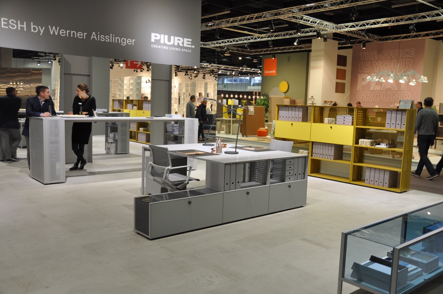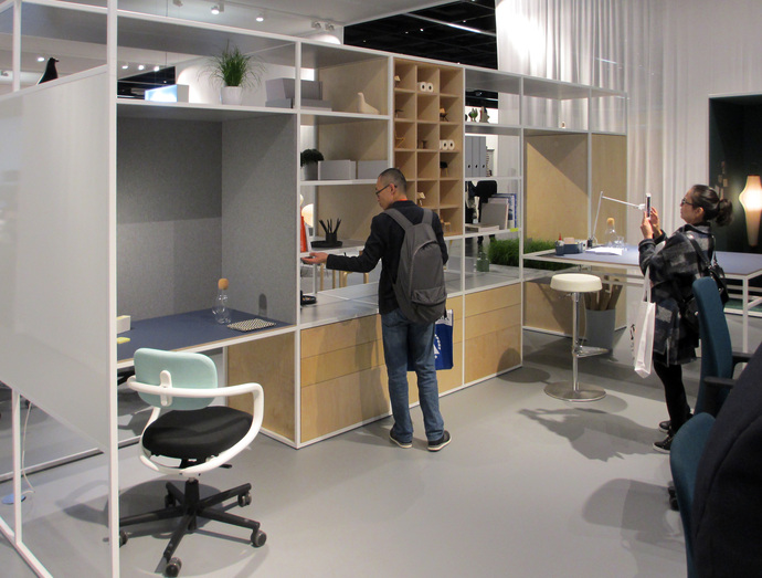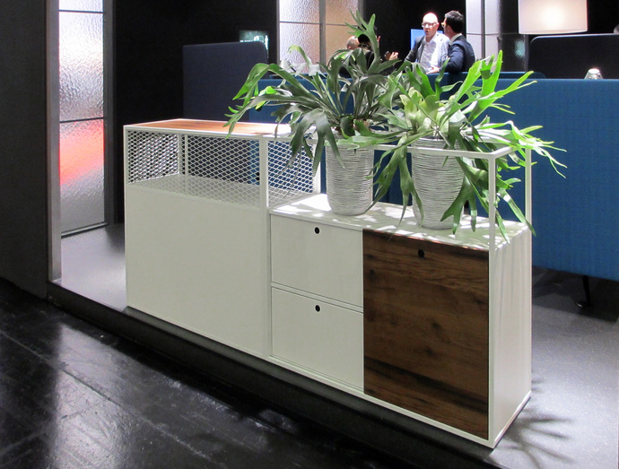 Lots of manufacturers also have low sideboards on display, though it remains unclear as to whether they meet an actual need or have just been assembled because they don’t disturb the openness of the stands’ architecture. Furniko at least has positioned one of the omnipresent acoustic elements on its sideboard, which thus becomes a bench. It seems there’s nothing to store away anyway. In its search for a second use for its side cabinets, Wiesner Hager came up with a special attachment for pot plants, which gives the furniture real mid-century appeal à la “Mad Men” – when in offices smoking was still allowed and people still wrote on paper.