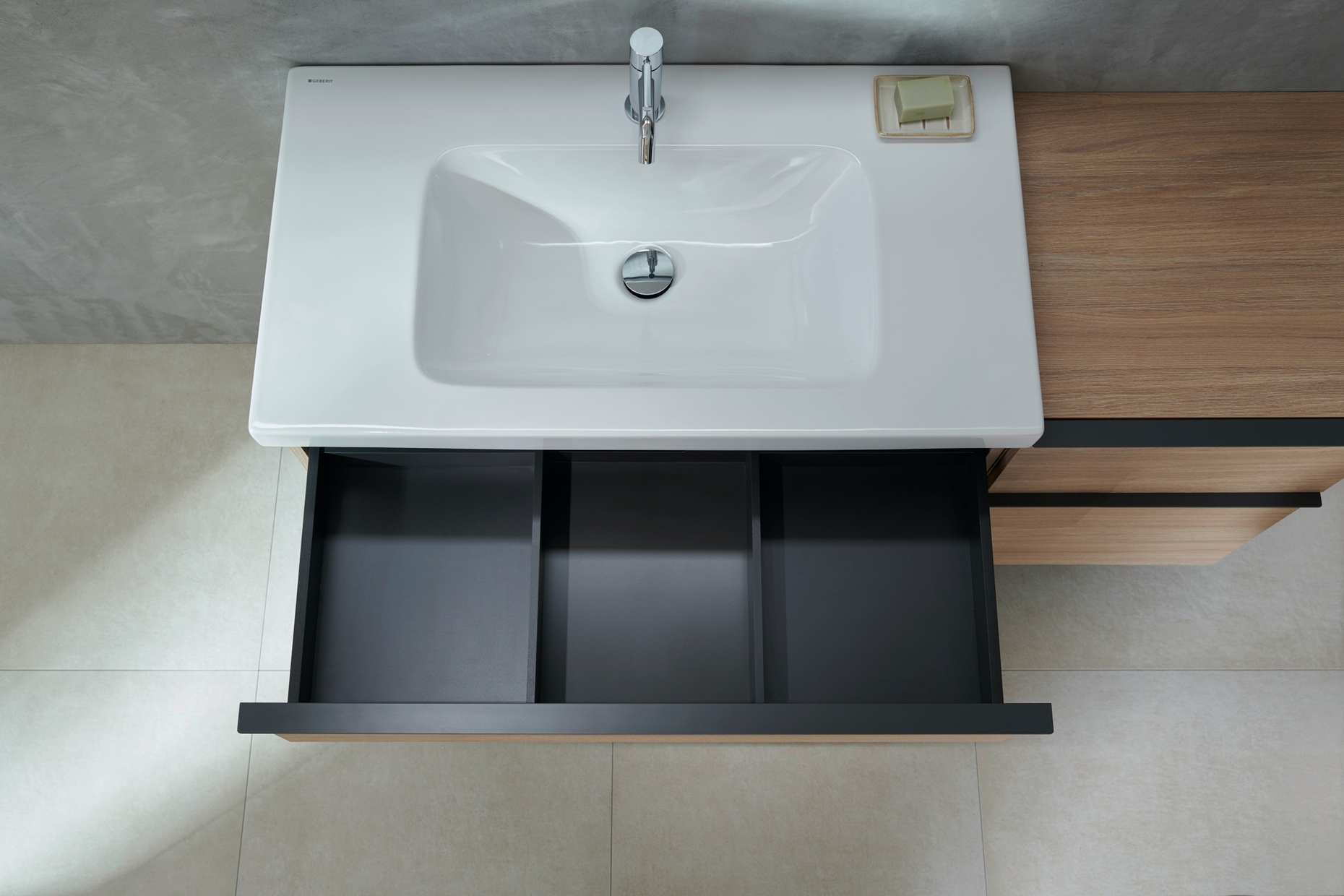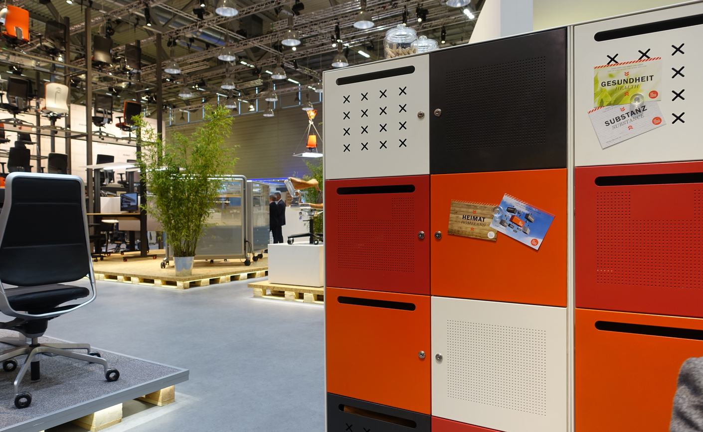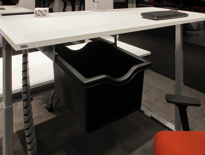 Anybody taking a look around this year’s Orgatec would be forgiven for suspecting that to a large extent the office furniture sector at least has decided to declare all forms of larger storage space superfluous. Visitors can enjoy an unimpeded view of the fair stands, because there is hardly a tall set of shelves or a partition in sight. If there is no room for something on an electronic storage medium it is confined to a small cabinet next to or beneath your desk – if you still have a desk of your own at all, that is. If you do desk sharing and move from one workstation to another, then you in any case have to make do with wheeled containers or lockers the size of letterboxes. There are also containers on display at Orgatec which you take out of your own compartment in the morning and attach to the particular desk you are sitting at. To this end VS has designed something in between a lunch box and a cool bag that is intended for office staff to store their documents and belongings in. For office furniture manufacturer Assmann, a straightforward small plastic tub has to suffice. It’s no wonder, because the company is also of the opinion that that for those who still have a desk of their own, the small personal storage space in the lower cabinet is in part superfluous. For this reason it is integrating a pull-out footstool there for putting your legs up.