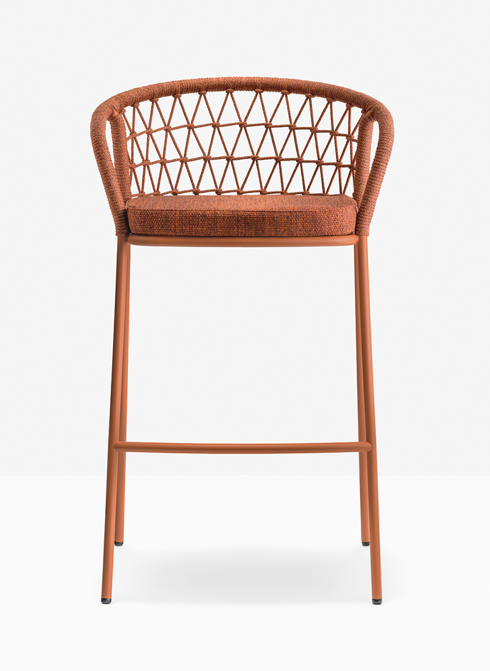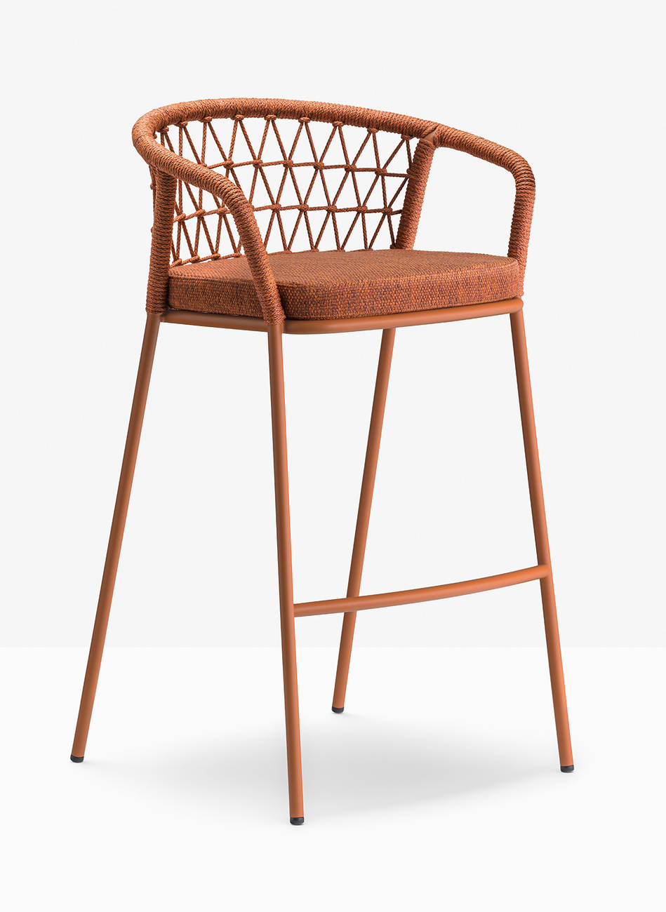 One of the most beautiful places to be when the temperature gets warm is at the bar: in the best of company and with a cold drink within reach, you can look out over the scenery from here in a slightly airy position. Although many bar stools are similar in their design, Pedrali will be presenting at the Salone del Mobile 2022 a extraordinary creation that is as practical as it is stylish with the Panarea barstool by CMP Design. The filigree tubular steel frame with angled legs merges seamlessly into the seat, on which a comfortable cushion rests. Made of quick-drying polyurethane foam, you can leave it outside even during short summer showers without worrying. The curve that continues from there is sweeping, enclosed in an artfully geometric weave that supports the back and at the same time represents a connecting reference to the armchairs in the collection. The polypropylene cord is hand-woven in Italy and also offers a pleasant, non-slip feel on the armrests. Meanwhile, guests' feet find firm support on the recessed support. And they are not the only ones who will enjoy the cleverly thought-out design by CMP Design for Pedrali – once curfew is reached, the Panarea barstools can also be easily stacked on top of each other. (am)