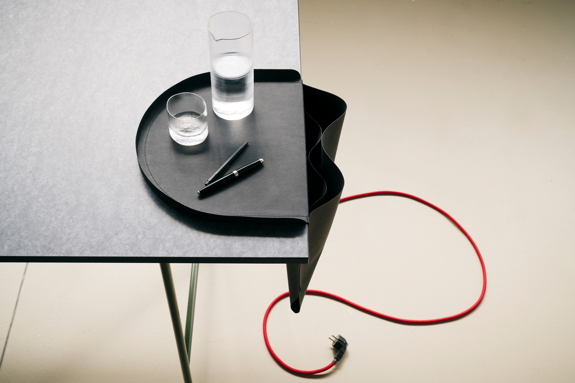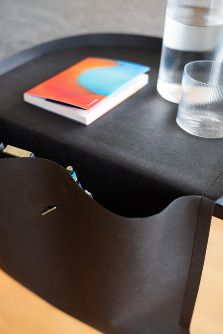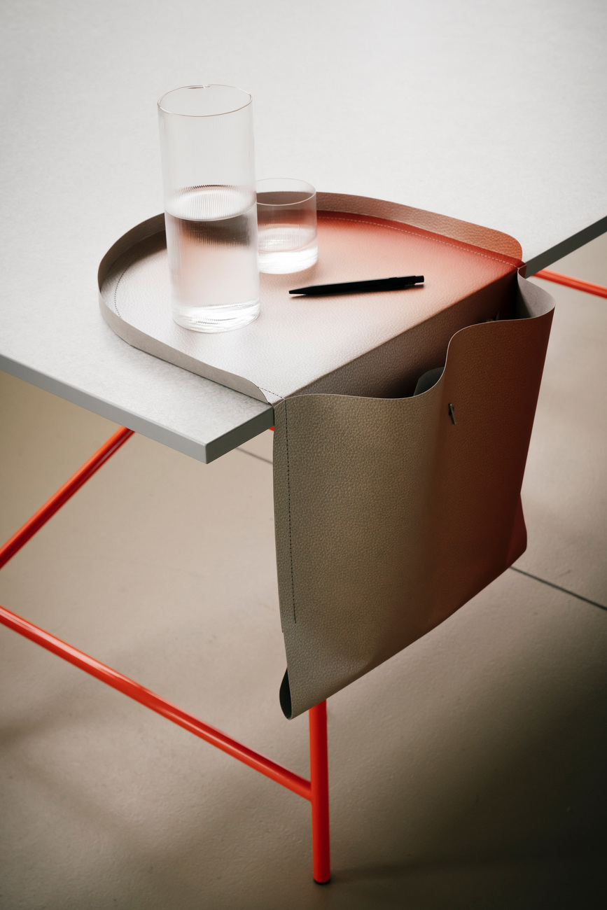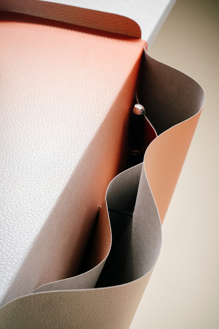 'Salto' is a "paper furniture piece for tidy work desks": This sustainable saddlebag for the desk quickly and stylishly brings order to any situation. Serving as both a storage object and a tray with two interior pockets, it gives everyday items a fixed place and is an eye-catching feature in itself. The versatile accessory is simply placed on the edge of the desk and maintains its balance without the need for assembly. 'Salto' is made in Germany from Papyr® – an eco-friendly, plant-based material derived from cellulose, which is OEKO-TEX® and FSC® certified. Washable and tear-resistant, 'Salto' remains a reliable companion. Available in black, stone gray, and a color gradient of orange/silver, it can also be custom-printed upon request, making it adaptable to any context.