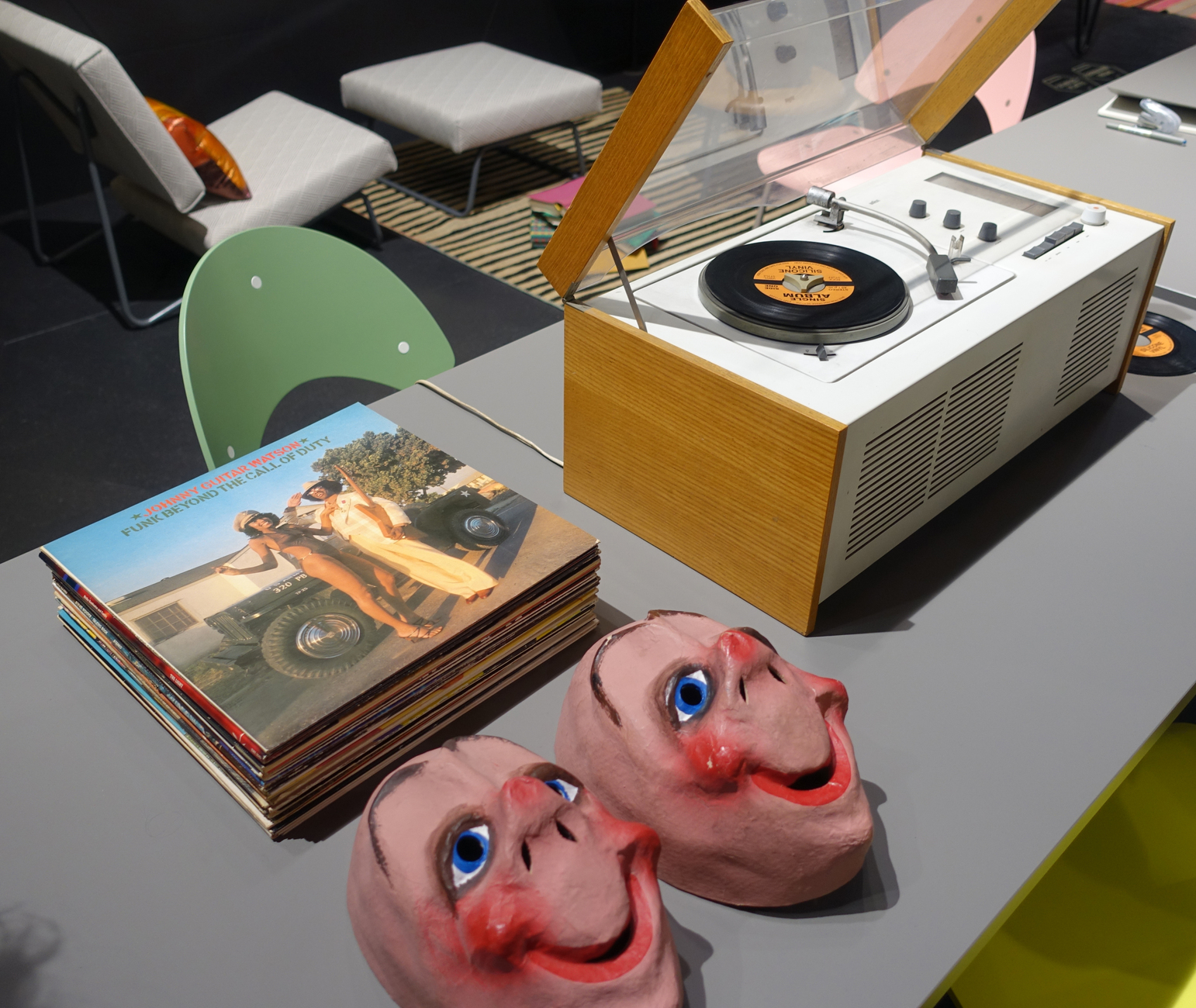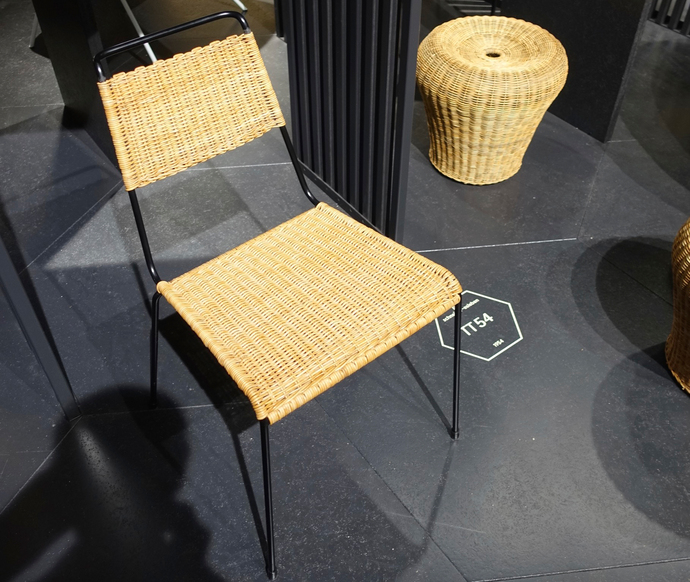 The very images and sound of the invitation (Igor Records) exudes the flair of the old days, broadly alluded to in titles such as “I am the Walrus” or “You Take My Self Control.” The path taken also continues in the design of the trade-fair booth with the Rams’ Braun hi-fi set, a portable radio and a stack of LPs. No streaming, here. The bonus track “Kiss that Frog,” a 1953 hit, also references the special design that came out five years later, namely Herbert Hirche’s “Frog-Stuhl.” This stacking chair originally designed for lecture theaters stands out for a seat (the frog’s mouth) that juts out far over the metal frame and a strikingly angled backrest. We can admire Paul Schneider-Esleben’s “TT 54” rattan chair for the refined elegance of the days of the Economic Miracle (caringly adjusted to today’s standards of ergonomics and comfort).