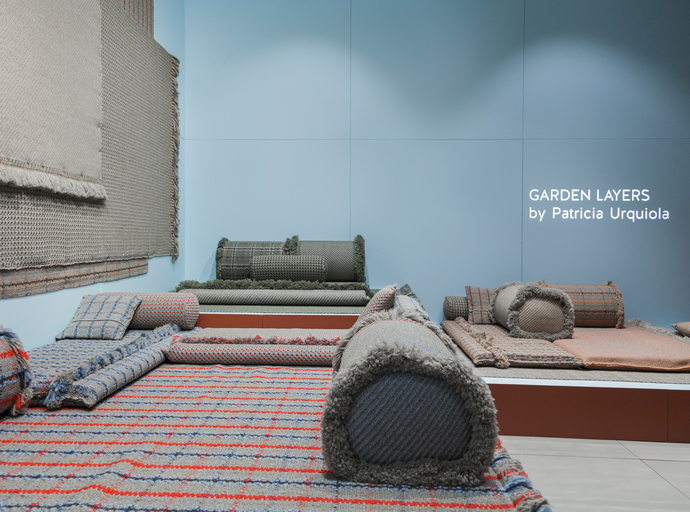 The journey into the wonderful world of graphics continued in Milan in one of the cloisters of the former San Simpliciano monastery, which formed an extraordinary stage, among others, for Florian Hauswirth’s “Color Stamp” and Maarten Baas’ “Ciliophora Green” for Nodus. Florian Hauswirth experimented with superimposed layers of colored surfaces to create a pattern reminiscent of bacteria seen under a microscope, while Maarten Baas delved straight into biology textbooks and derived his pattern from the Ciliophora ciliate – an inhabitant of the oceans that is actually less than one millimeter in size. Transformed into a pattern, the single-cell organism’s longitudinal shape prompts viewers to seek to discover something known in the collection of lines – even possibly a maze seen from a bird’s eye view thanks to the carpets intense green.