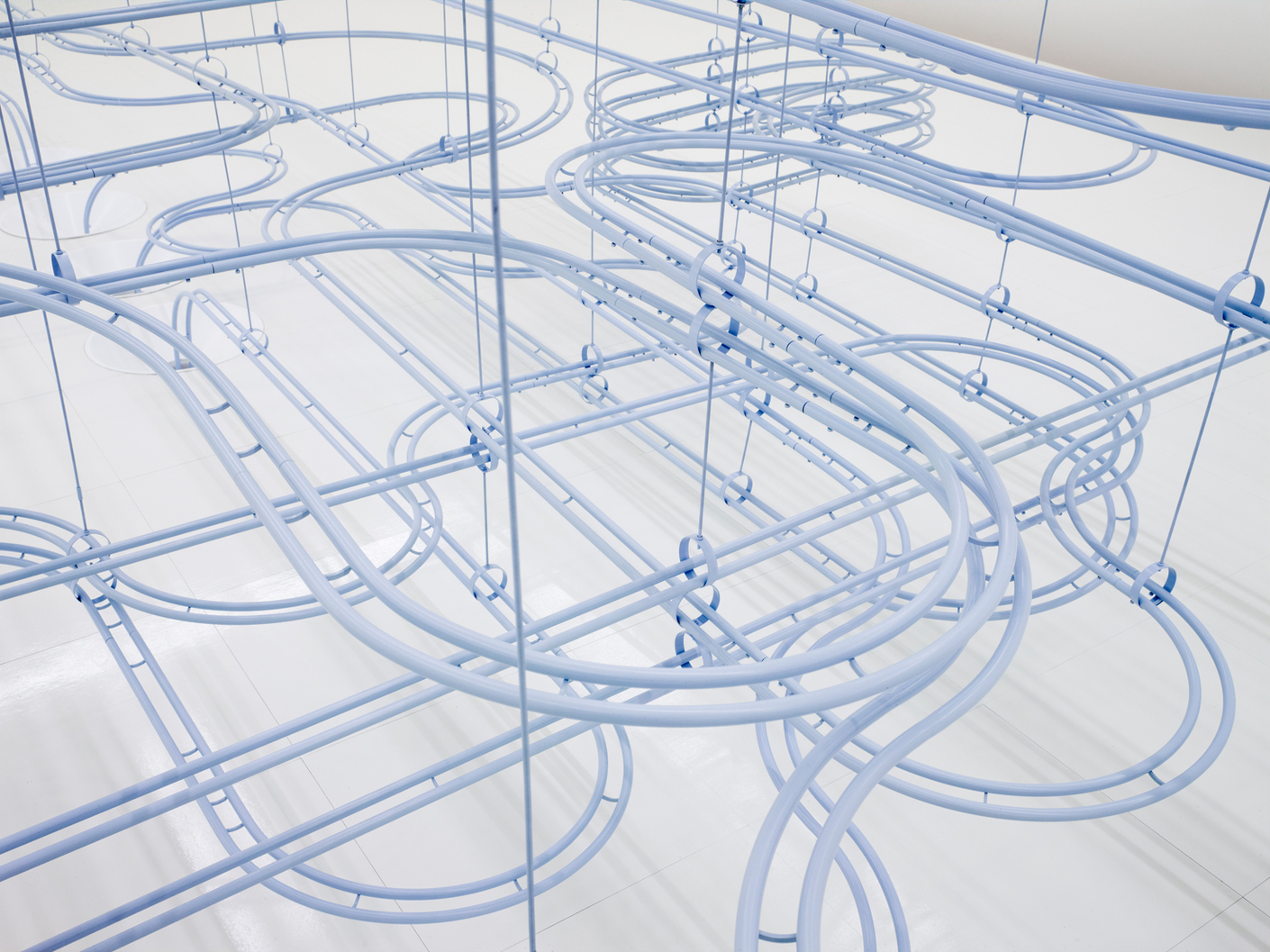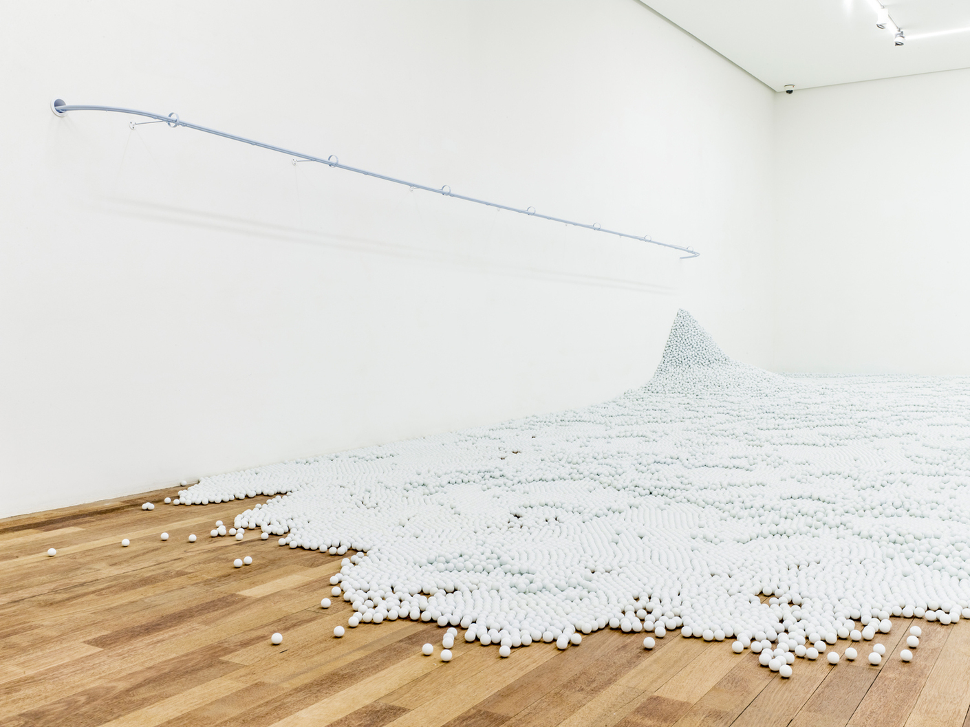 New York’s “Snarkitecture” collective have, with the support fashion label “Cos” realized an interactive installation at the Gana Art Center in Seoul, South Korea. “Loop” consists of a seemingly endless, room-filling marble run, whereby the white balls roll along a white double-tube structure made to the utmost precision. With this piece, Snarkitecture are returning to a concept they first presented in 2014 at the Art Basel Miami Beach with their “Marble Run” installation. In Seoul, however, the seemingly endless runs and long distances covered by the marbles gives rise to a completely different overall feel, which emphasized the meditative element of the marble run. (fap)