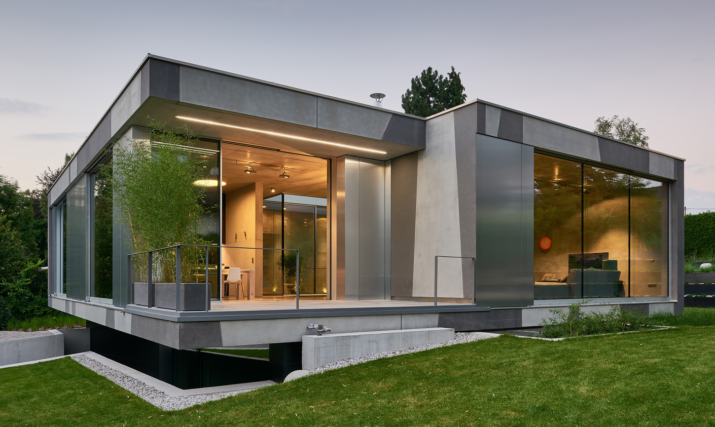 A façade made of fair-faced concrete can actually fit superbly into the countryside idyll of Starnberger Sees as can be seen from the detached house designed by architect Uta Di Simone. The brief was to create “a standalone new build with a provocative touch”. The detached single-storey house in the small town of Berg is certainly an eye-catcher: The no-frills cube with the podium storey stands out emphatically from the typical construction style in the region thanks to the clear coolness of the fair-faced concrete. The floor-to-ceiling windows ensure that the building has a distinct sense of lightness about it. The choice fell on frameless cero sliding windows by Solarlux erasing any strong distinction between interior and outdoors. The spacious glass surfaces allow much natural daylight to enter the inside of the building while offering a gorgeous view of the green world outside.