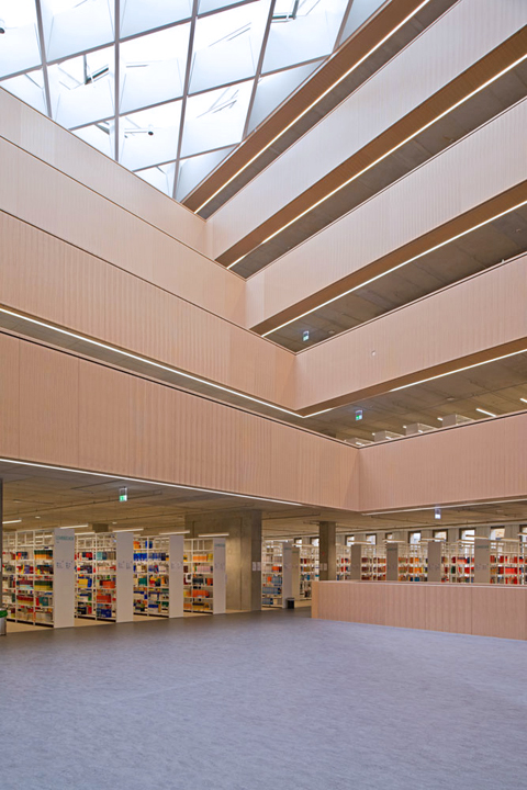The hollow floors from Lindner’s "FLOOR and more series" enabled the architects to meet the different load-bearing requirements of the various areas flexibly. To this end, elements from "FLOOR and more power" in 10 and 20-KiloNewton versions were combined with "FLOOR and more comfort power", and different carpet stone and parquet coverings then used. In addition, an integrated floor heating system was deployed for the highly frequented zones, optimally regulating the ambient temperature in winter. And it’s not just the users and visitors who need to feel good. The books themselves pose a major challenge as regards ambient temperature and moisture, one that was mastered by ventilating all the shelves from below.