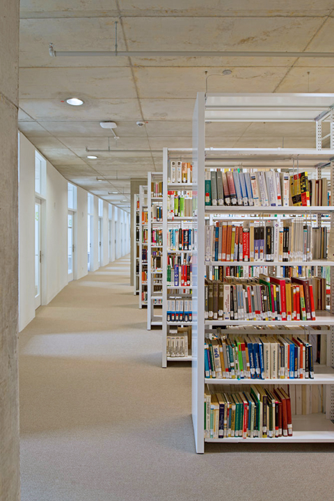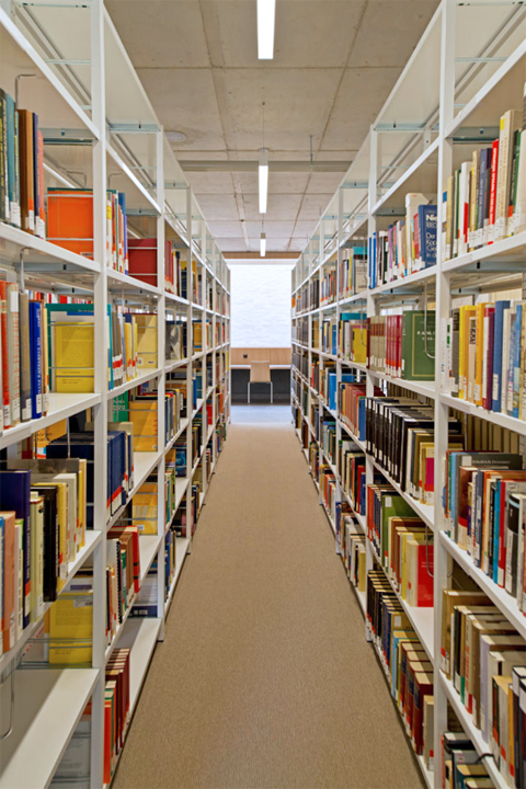 The wraparound galleries house the “on-the-fly workstations”, while the quieter “permanent workstations” are located along the outside walls. The potential for peace and quiet (and thus for study with great concentration) increases not only horizontally, but also vertically. The ground floor accommodates the collection of reference works and text books, which is highly frequented, while the specialist reading rooms with open-access shelves are on the floors above. In other words, the number of visitors differs by floor and within the individual stories, depending on the frequency of users and the particular books kept there.