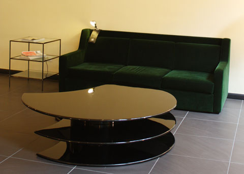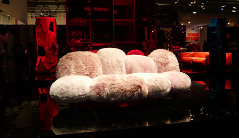 "Segreto" is a becolumned, castor-based item with various mirrors consisting of a steel/aluminum frame covered with leather profiles in black, red, white and green. "Scrigno" is a kind of chest of drawers with wing doors covered completely with colored acrylic mirror fragments, such that the furniture and the room seem to completely shatter before our mind's eye. Hard to be crazier, you might think. But the "Cipria" sofa goes even further. Six-eight individual, marsh-mallow-like cushions, covered in eco-hide, (available as sheered or in a long-hair version) transform the sofa into an object that could be termed a mutation from Pop Art and Mannerism.