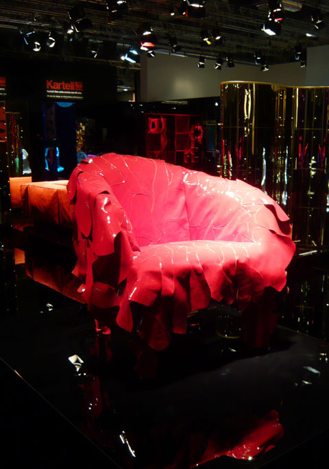 Edra has never made any bones about its approach, and in Milan it again set out to do justice to its reputation. "Shining" was the motto of the completely black trade fair stand, where Fernando and Humberto Campana displayed a veritable array of new products: the "Cipria" sofa, "Segreto" and "Scrigno" (both storage furniture) and their "Miraggio" mirror. And once again everything seemed to have been borrowed from an extravagant costume film.
