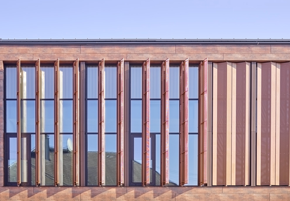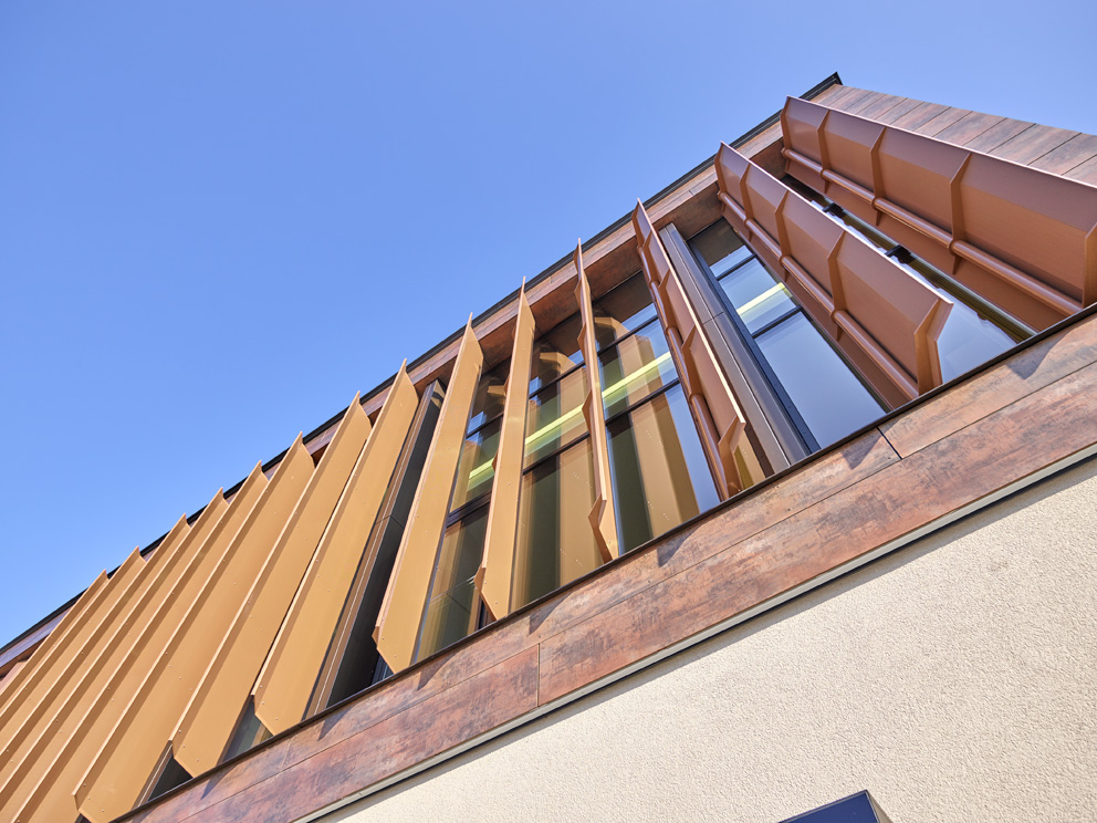 The Civic Center in St. Marienkirchen, near Schärding in Austria is a place where people meet and are active together. United under a single roof are the municipal authority, commercial tenants, rehearsal rooms for the State School of Music and a large events hall. The consciously plain volume was designed by Pauat Architekten ZT GmbH. On the bright podium rests a second, far higher storey clad in copper – the spacious glass window frontage references the events hall and rehearsal rooms behind. One special feature of the building: its striking façade, consisting of Colt sunshade louvers that are almost five meters’ high.