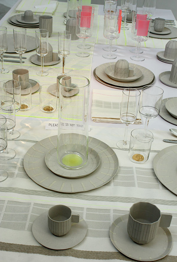 Carole Baijings: The nice thing is that we never add colors and patterns at the end; they are always part of the design process. We don't design a table and then decide to make it red. We start with the red! You can see it in the glasses for "Total Table" too: The lines that are on the glasses now come from the adhesive strips we used for the models. In the finished textiles too, you can still see the Scotch Tape we used for the paper models and the fluorescent paint we applied in-between.