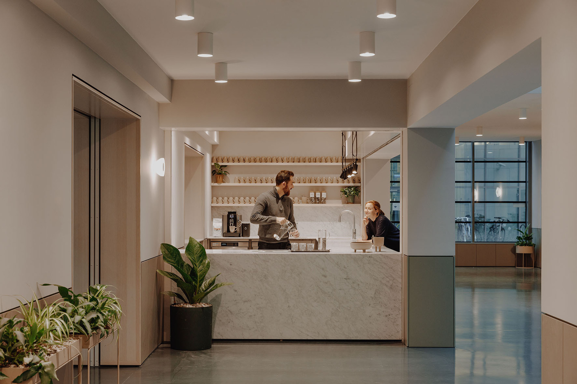 TOG’s new location in Frankfurt which the provider of flex offices recently opened strikes one as bright and inviting. Its name “Oper46” is already a clear indication of its central and exclusive location next to the Alte Oper concert hall, rebuilt in a neo-Renaissance style, and Rothschildpark. Together with London architecture practice dMFK Architects, TOG has infused new life into the office building at 46 Bockenheimer Anlage: Plans were needed for a total of 6,700 square meters spread across six floors. In order to underscore the expansiveness of the area some walls in the spacious entrance lobby were removed; from here your gaze can now travel as far as the nearby park. A reception of greenish black marble makes for an eye-catching element in the entrance area that otherwise (like most of the rest of the interior design) boasts in light, neutral tones in nude and sand shades, complemented by objects and wall colors in matt black and dark gray. Moreover, custom-made fitted wooden sections provide somewhat secluded seating and a pleasant warm touch. Similarly, for the central atrium dMFK Architects rely on light wood and have created a so-called “breakout-area” styled on the Spanish Steps, a central meeting place lit by daylight entering the glass roof and with direct access to the other floors. Thanks to greenery installed at the edges of some of the steps the space also has an invigorating air about it.