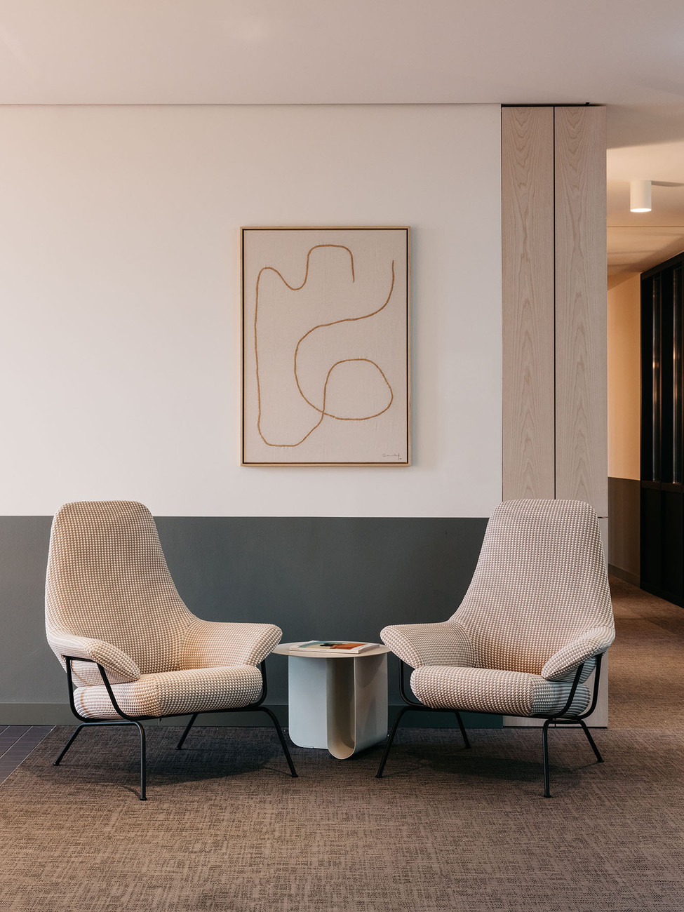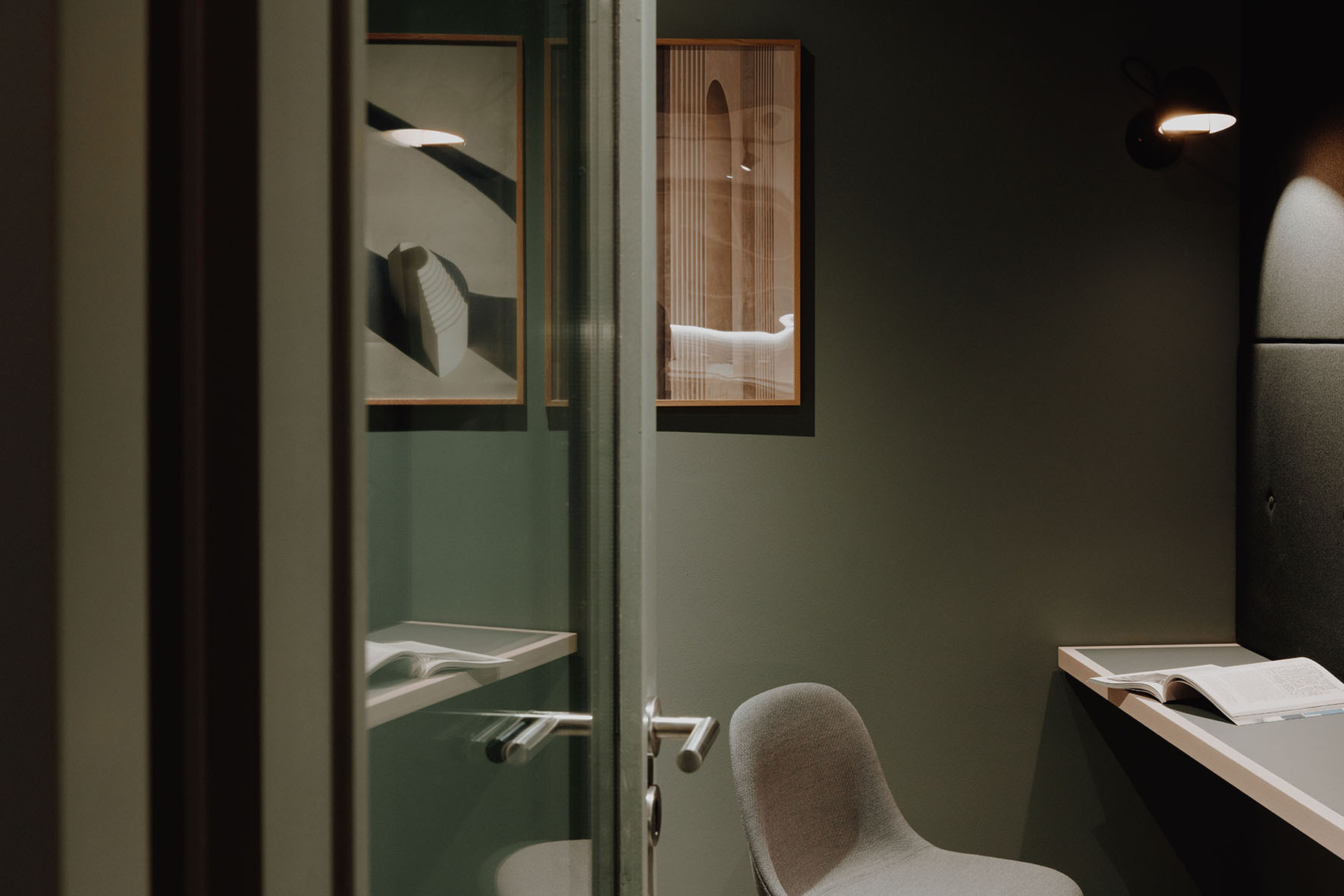 If you sit down briefly on the stairs and look upwards then the stories that extend up around the atrium stand out for their clear lines: White panels, glass, handrails and railings of black and silver metal. Those familiar with the previous projects and the loungey atmosphere of TOG might be somewhat surprised. “The design was not meant to be overly playful, but in keeping with Frankfurt/Main, sophisticated, grown-up and cool,” explain Charlie Green and Olly Olsen, who founded TOG in 2003. It is part of TOG’s concept for design-oriented, flexible workspaces to adapt the design of its co-working offices to the respective character of the city. The interior only becomes more intensive in color and materiality in the meeting rooms, each of which is styled differently and feature the shades deep petrol, subtle terracotta and rich burgundy. In the co-working spaces and in the private offices you can take a seat on office chairs by Vitra or in the conference area inspect the new chair by Norm Architects that was purpose-designed for the project. With an ergonomically shaped backrest of solid wood and black tubular steel it ideally reflects the intensive contrasts of the light and dark surface that alternate throughout the entire interior.