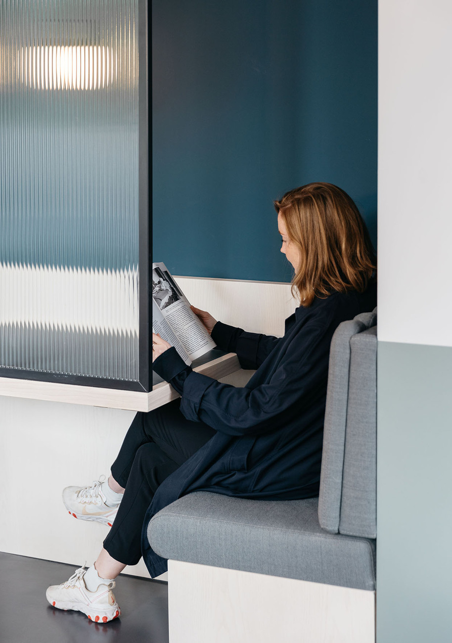 Indeed, there is a focus on furniture and accessories by Nordic manufacturers in TOG Oper46, be it Gubi, HAY or Kvadrat. The latter, for example, supplied the acoustic panels that, complemented by numerous curtains, make for pleasant room acoustics and occasionally also serve as subtle partitions for the numerous solo workspaces. Other partitions are provided by glass doors and opaque acrylic glass panels that structure the spaces yet also help to retain their bright and open look. A special highlight awaits guests on the uppermost floor: The spacious roof terrace provides ample seating for a meeting in the fresh air along with a magnificent panoramic view of the nearby skyline and the imposing building of the Alte Oper.