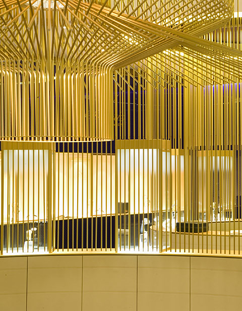 The view of the lake is bewitching: The project teams work by topic in the former hotel rooms, which have been opened onto the corridor backbone. On the rear of the building is a display window of sorts. Objects, prototypes and material research work stand in the niches. It becomes evident how much effort Atelier Oï puts into experiments and conceptual work. They work increasingly for major brands and this gives them the liberty for such experiments. "We work according to the yeast principle: One project grows into the next one," says Aebi. For example, the designers explored the various creative possibilities for cord. Ropes wind their way into a coat stand and coil themselves into a seat, cord quite literally becomes the central thread in an exhibition by the Mudac in Lausanne, like on a reel of thread cord wind around the stool "Reel" (2009) for B&B Italia. They have also explored the topic of rods: For the confederate Swiss exhibition "Expo.02" the exhibition complex on the lake shores of Neuchâtel was given a glowing expanse of reeds that were actually rods. And bronze-colored rods are the trademark of the Breguet shops worldwide, metallic rods make the poetic luminaire "Allegretto" (2009) for Foscarini resound. Aurel Aebi calls this a creative chain reaction. The trio recently explored the material glass. This was prompted by a commission from Bulgari to design a flacon for the perfume "BLV II" We had to present a fragrance, a good that is as fleeting as it is precious". They experimented a long time before finding the right shade, whose gentle blue now emphasizes the linear and curved shapes of the crystalline housing.