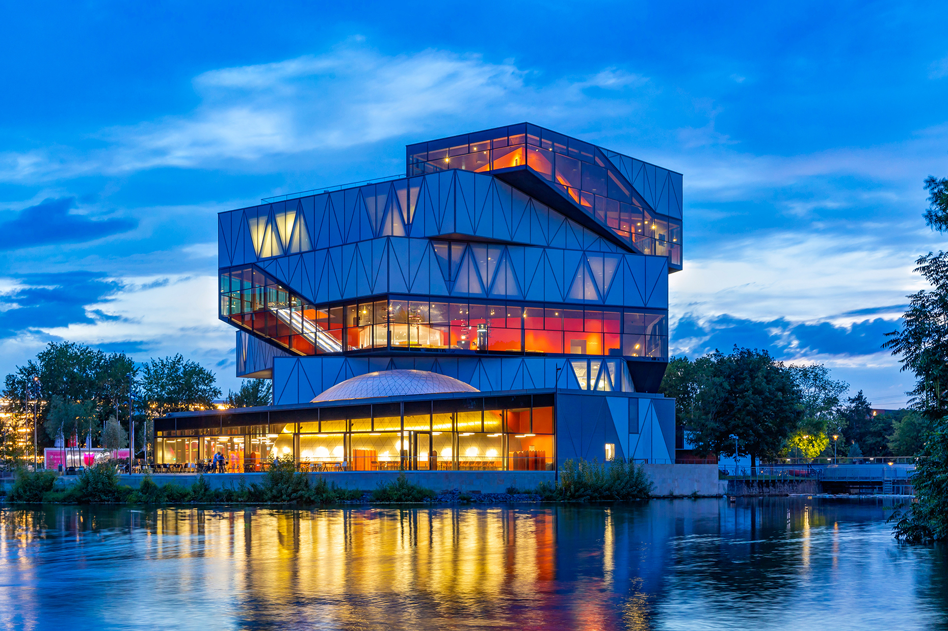 The warm air from the room flows through the high-performance type AASI.51 cooling units mounted on the ceiling, the cooled air passes through the down-shaft and then back into the room. Furthermore, all the electric and data cables required are hidden away behind the air vents, but this also means they are very easily accessible at all times. With their 2.5-mm grid, the KSM-V grilles by TTC Timmler Technology that cover the air vents make for an attractive appearance and are easy to open. In order to make sure that this ecologically exemplary building concept was ideal in all respects TTC Timmler Technology developed the location-specific solution in close collaboration with the architects and planning experts. Consequently, this natural climate control system not only goes easy on resources, it also saves costs in the long run. Its innovative building air conditioning system was an important factor in Experimenta Heilbronn receiving the “DGNB Diamond” award from DGNB, the German Sustainable Building Council, for the outstanding quality of its new building’s design and construction. This was the first time that a museum was honored with DGNB’s highest certification. As well as providing the gravity cooling system with its filigree air vents TTC Timmler Technology equipped Experimenta with a smoke extractor for the stairwell and stainless-steel guttering. The guttering derives its zigzag shape in the fountain area from the building’s unusual architecture, with Sauerbruch Hutten Architekten making an architectural statement on the banks of the River Neckar – with each story a block shaped like an irregular pentagon and rotated on the core shaft as well as a façade divided up into triangles. In the sustainable concept for the project TTC Timmer Technology’s innovative solutions ideally complement the overall experience at Experimenta.