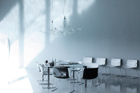 Light chandeliers in the meeting room of the headquarter: The hanging lamp “Lightweight”. Photo © Sara Bertsche, Stylepark