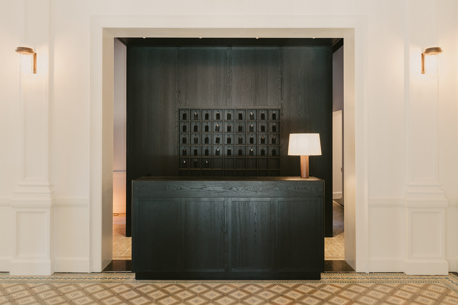 The hotel entrance is marked by a facade and canopy structure of black steel that forms a stark contrast to the red brick facade. This is an allusion to the glass roofs that once covered the terraces of the hospital pavilions. But this contemporary touch is also a pendant to the Art Deco elements that adorn the facades of the nearby Cogels-Osylei street. A glance inside testifies to the same care being given to preserving historical details and combining them with a contemporary design language: Decorative moldings on the walls, attractive tiled floors and a minimalist blackish-green seating in the reception area.