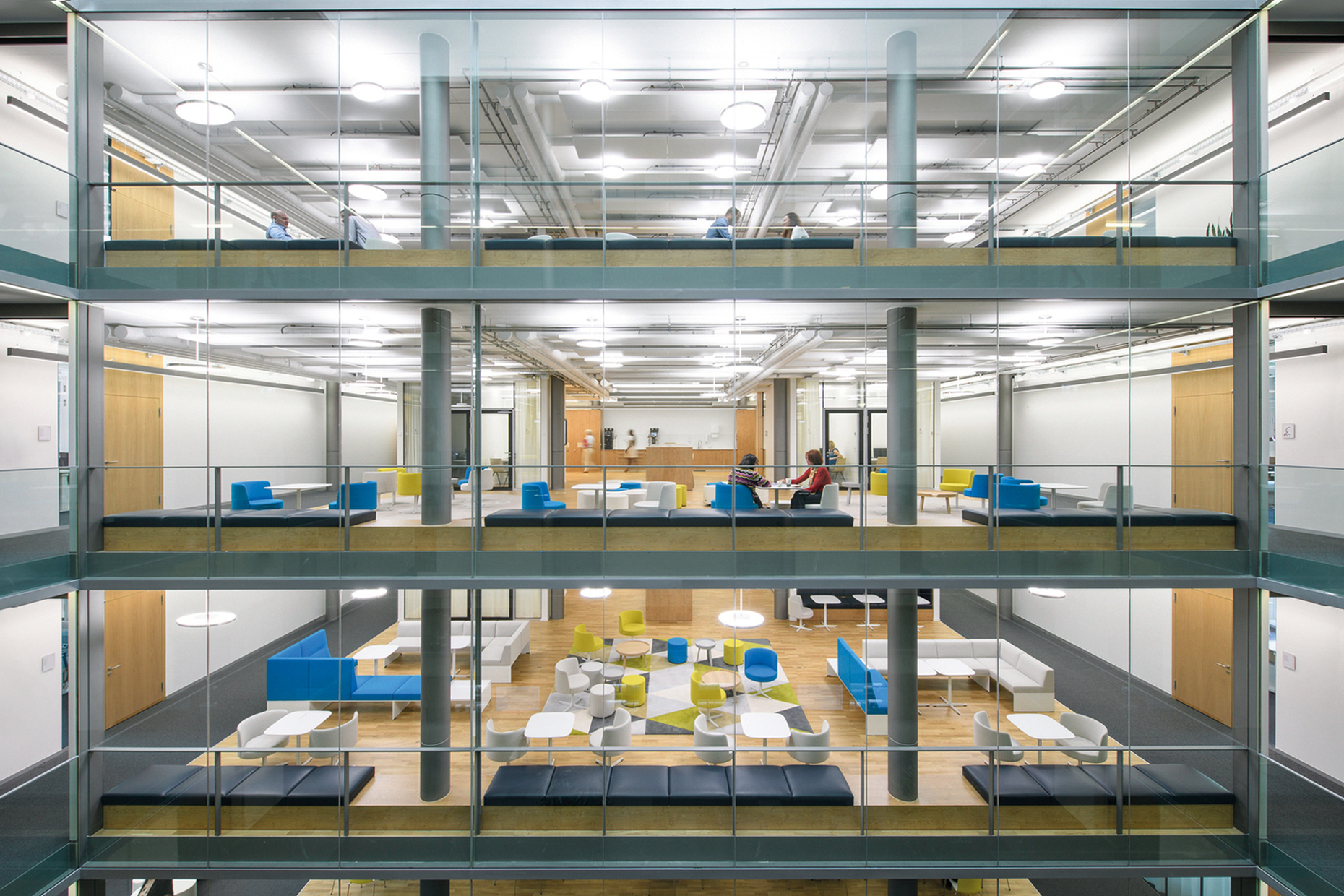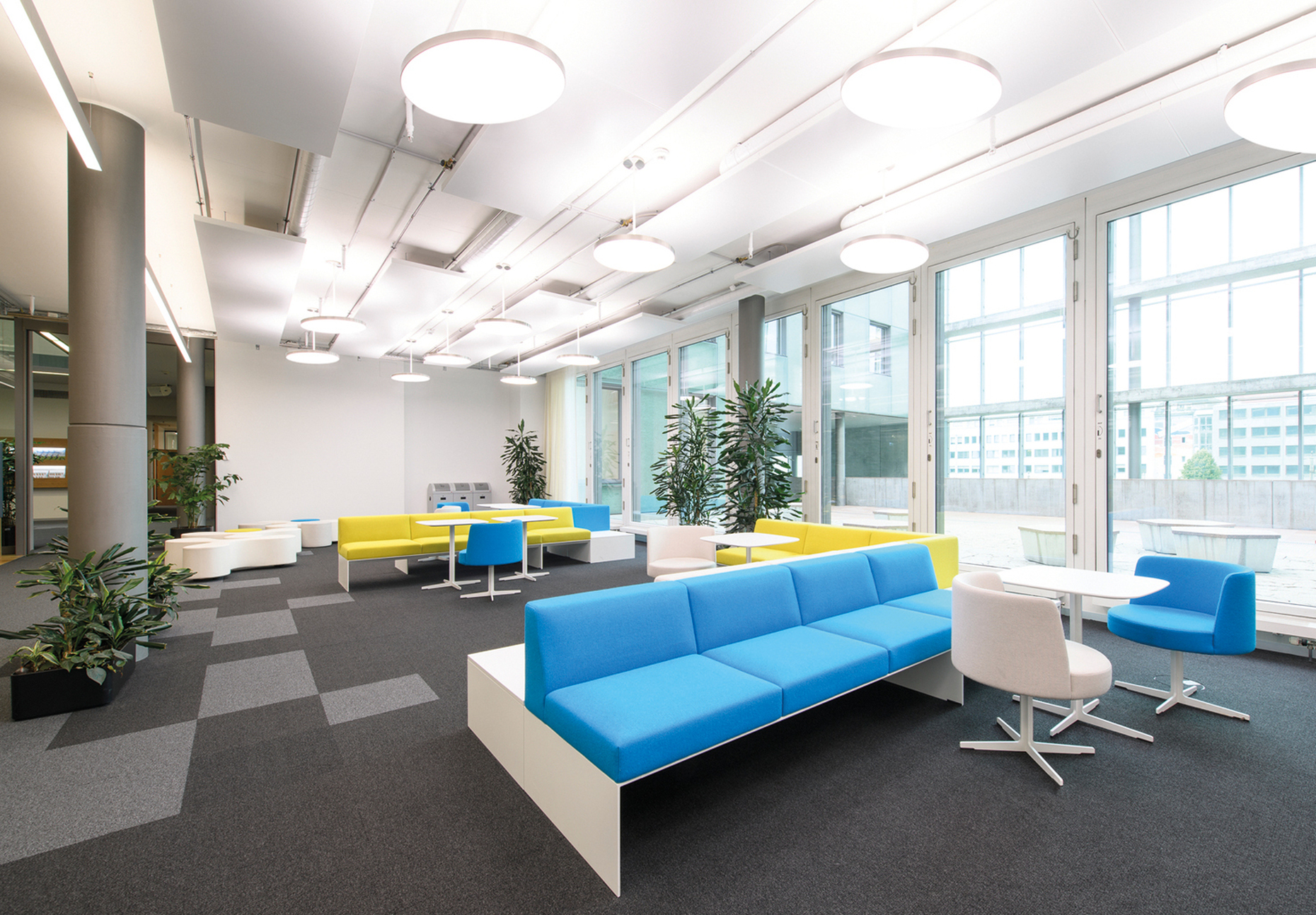 Lighting specialist Waldmann has made for a pleasant working atmosphere in Bayer’s head office in Basel. For example, with its direct and indirect light the suspended luminaire “Idoo.line” ensures uniform light distribution in the meeting areas. And the delicate suspended luminaire “Vivaa” supplies ideal light for the communication hubs in the offices. Fitted with LED technology and biodynamic light, it mimics natural daylight and supports our inner clock by ideally stimulating the body’s activity and resting phases. By harnessing the positive physical effect light has on people, “Human Centric Lighting” or HCL helps foster productive work.