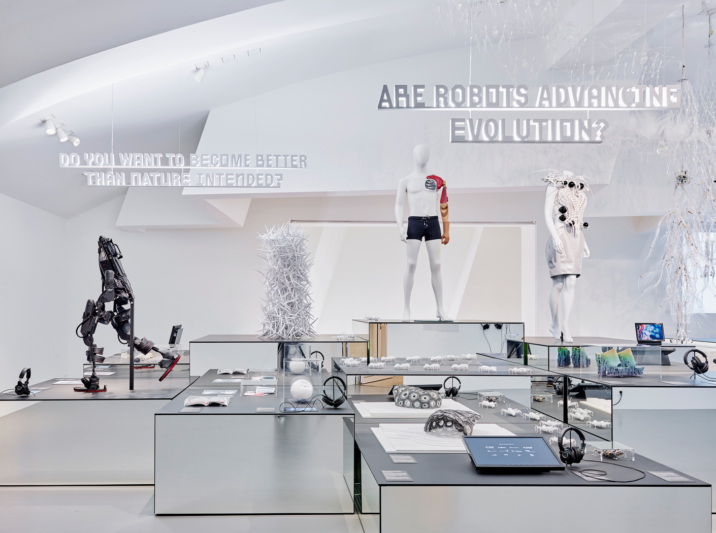 This is addressed in the final room “Becoming One” housing exhibits including Canadian architect Philip Beesley’s beautiful organic-looking (but essentially just decorative) “Hylozoic Grove” of kinetic coral-like structures and Anouk Wipprecht’s (equally decorative) show-stopper “Spider Dress 2.0.” More science than theatre, though, are the advances in smart prosthetic limbs, and exoskeletons shown here, which allow the paralysed to walk or lend superhuman strength to the wearer. It is interesting that we seem to readily accept and even welcome such cybernetic intrusions – even when it means such devices involve direct implants into our bodies or brains. But the speculative design of synthetic bees (“NewBees”) by Greenpeace, to keep pollination going (and thus the planet alive) in an increasingly real looking near-future scenario where we have managed to wipe out all the living versions, thanks to our own stupidity, again plunges us back into the uncanny zones of creepiness.