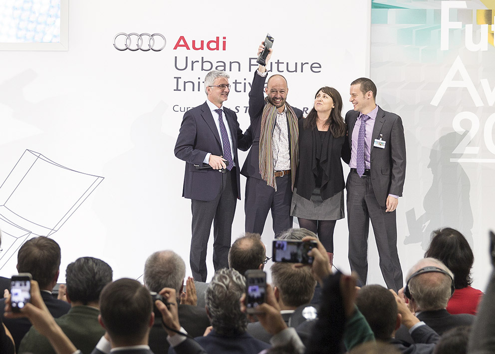 Victory in Berlin: architect and city planner José Castillo was awarded by Rupert Stadler (CEO AUDI AG, in the picture left) with the Audi Urban Future Award for his “operating system for urban mobility” for Mexico City, in cooperation with Gabriella Gomez-Mont and Carlos Gershenson. Photo © Audi Urban Future Initiative
