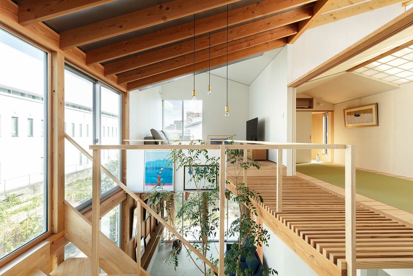 Something else that proved ideal for the new situation was the decision to plant a Formosana ash tree in the doma itself. It stays partly green for the entire year and its leaves extend into the fop floor. Thanks to a large skylight ample daylight enters the kitchen installed there as well as the television room and bedroom. To the side and somewhat separate is the washitsu – a traditional room for receiving guests fitted out with tatami floor mats and sliding screens of wood and rice paper, shōji. In this manner Kohei Yukawa has integrated elements of traditional Japanese architecture into the entire house but also adapted them to the lifestyle of a young family. Moreover, custom-made cladding, stairs and fitted elements of wood provide practical storage space and a pleasant, cozy feeling. In addition, the differing ceiling heights and the impressive diversity of materials and structures contribute to the living space seeming much larger than it actually is in terms of square meters.