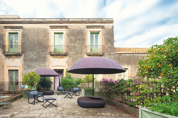 Bistrò structure is produced in varnished aluminium and is available in avorio, grafite, mora, ruggine, sottobosco, oliva or foresta colour; supporting rods are made of fiberglass varnished in the same colour of the structure. The structure is also available gloss varnished in avorio or grafite colour. The sunshade is in Madras or Tamil, Paola Lenti's signature fabrics. Bistrò can be used with the Clique series, designed by Francesco Rota and composed of seating elements with removable cover and side tables.