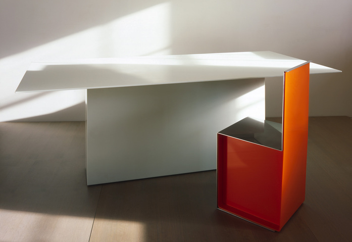 Black and Orange Table and Chairs; Made in 2006. Table made from LG High-Macs with an acrylic 'collar' and polished aluminium underside. Chairs are powder coated aluminium with acrylic sides and backs.