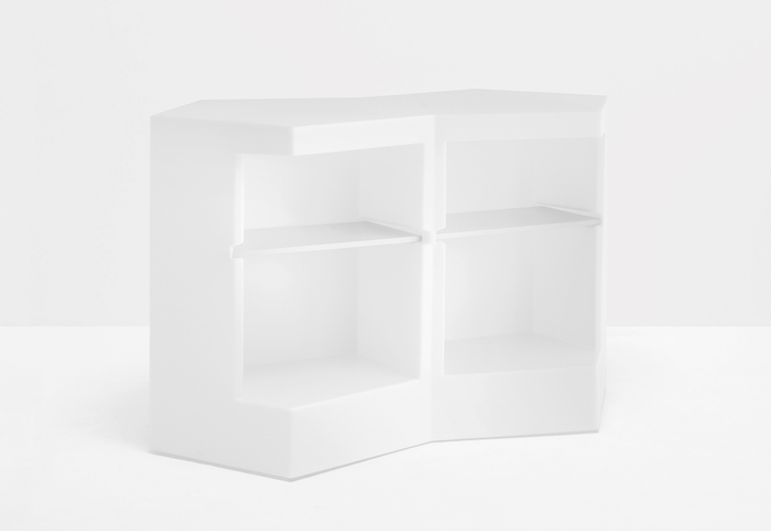 Shaped like a block of ice, this modular bar counter is the heart of a convivial outdoor environment like a bar by a pool, a beach or a garden. Made in high-density roto-moulded polyethylene, the modules of the Iceberg have a double pentagon shape and allow to create endless combinations. A lighting kit, an upper methacrylate top and steel inner shelves are available as optional/accessories.