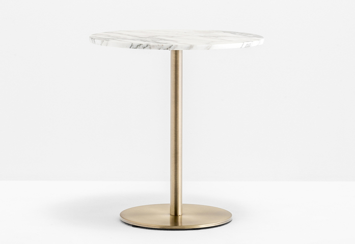Inox table base, polished stainless steel base with Ø50 mm column. Tempered glass top. Height 730 mm. Top max D700.