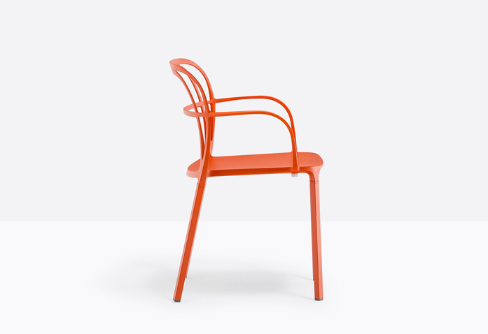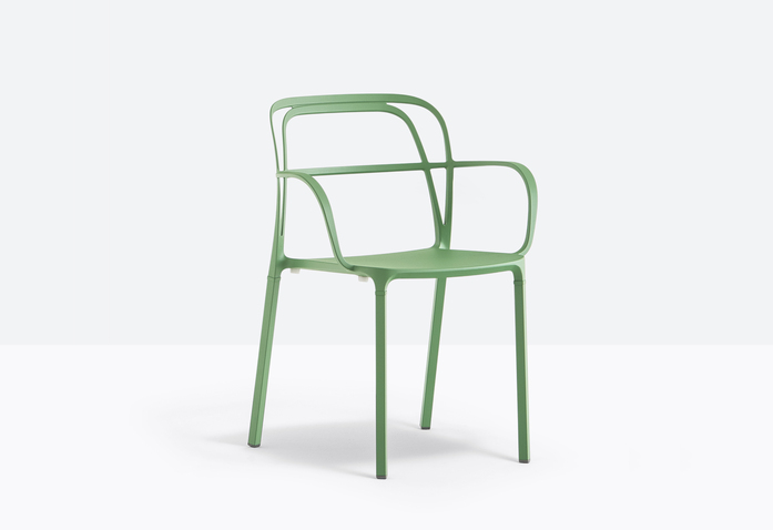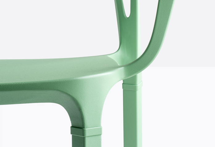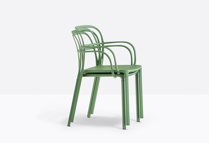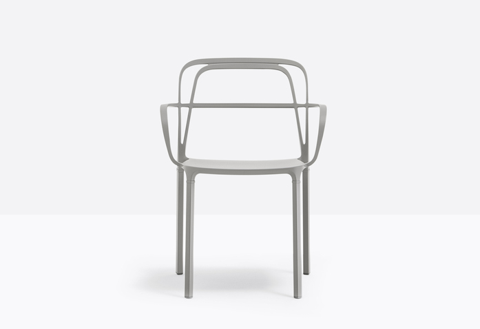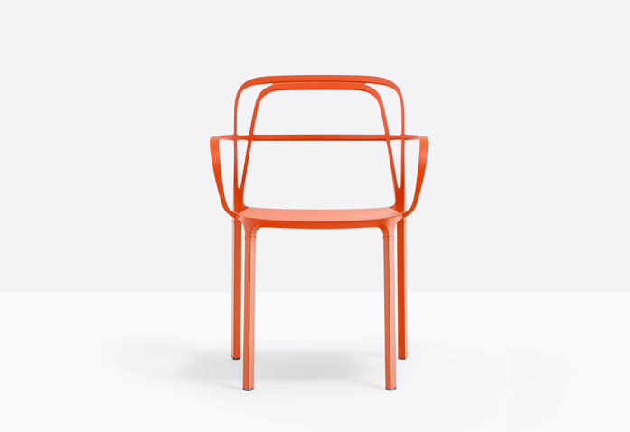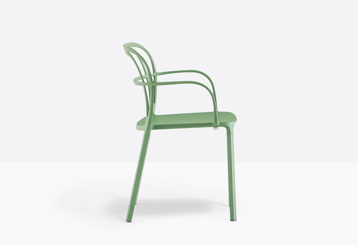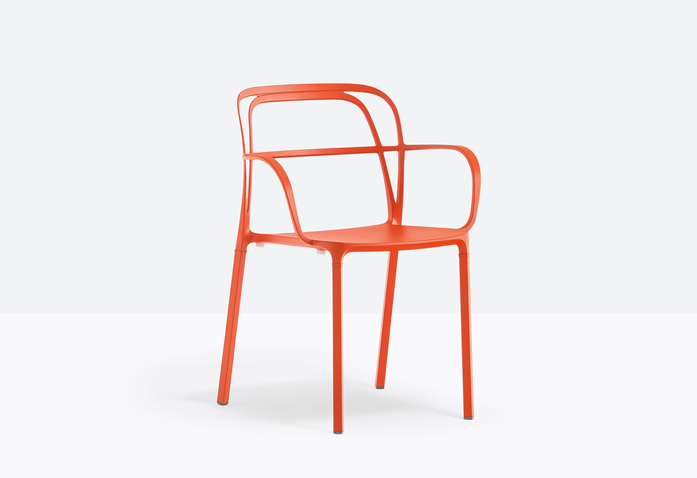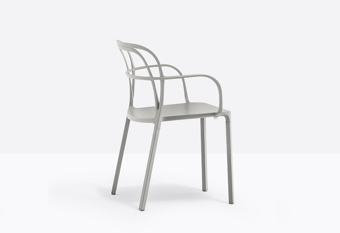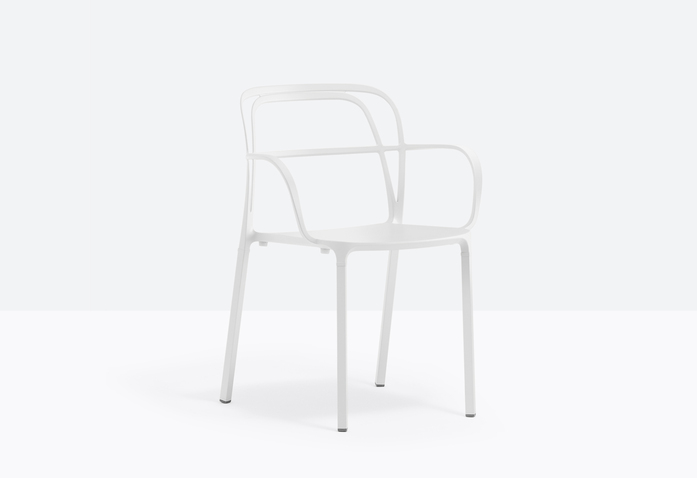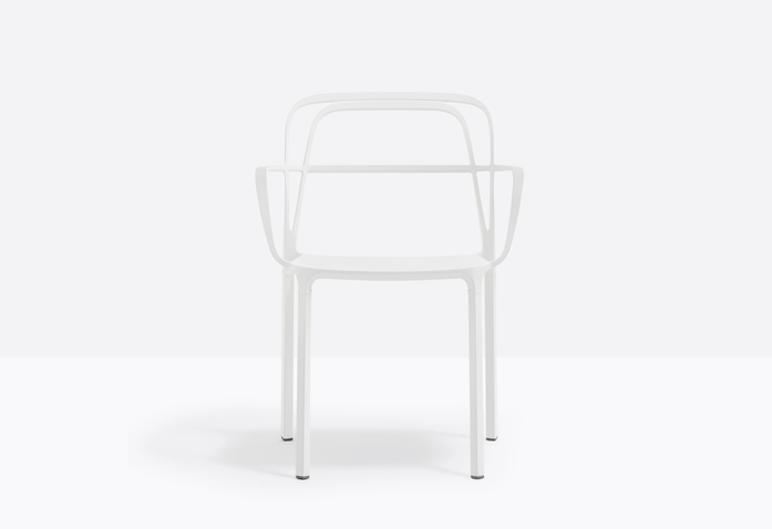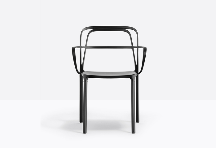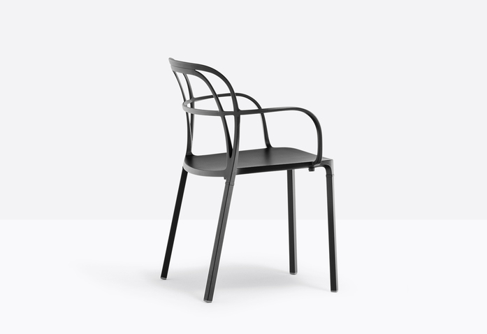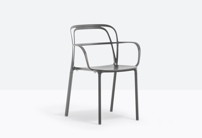 A combination of lines which twist harmoniously creating an involving, minimal silhouette. The main feature is represented by the aluminium die-casting which creates different sections for the backrest, armrests and legs.