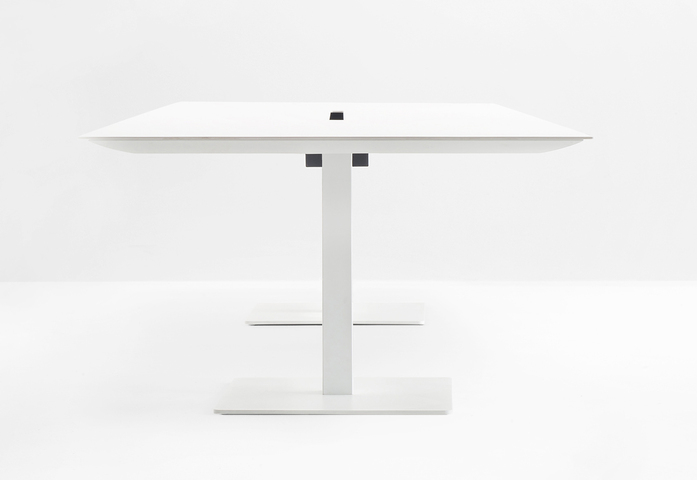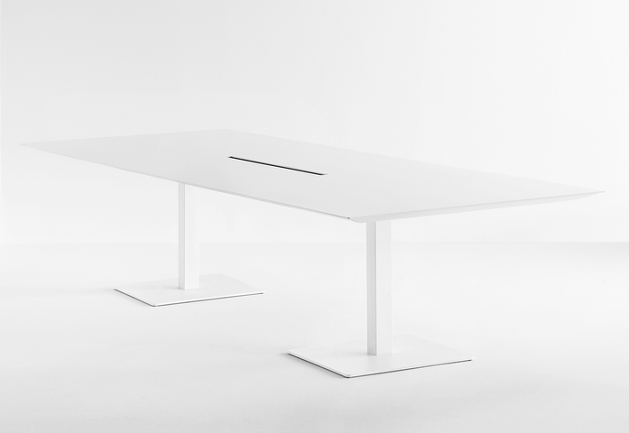 Plano 2 is a collection of tables for the office with a thin and essential aesthetics. The ultra-thin solid laminate top lies on an extruded aluminum frame fixed to the two square bases. Available in three different sizes with and without cable management. The two square bases can be in brushed stainless steel or white powder coated.