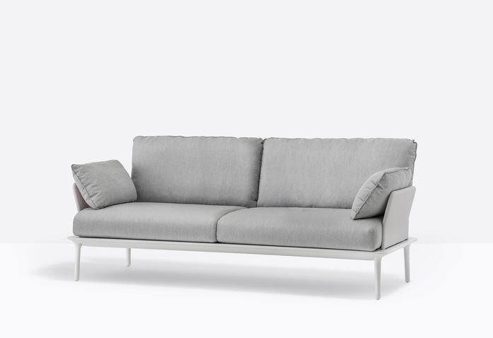 Reva is an outdoor collection with smooth lines and generous sizes. Three-seat sofa with a thin extruded aluminium frame supported by four tapered die-cast aluminium legs that underline its clean design. Cushions in waterproof fabric and polyurethane foam inside.