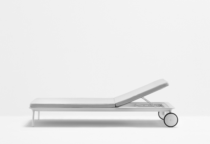 Reva is an outdoor collection with smooth lines and generous sizes. The Sun lounger has a thin extruded aluminum frame, two tapered die-cast aluminum legs and two rear rubber-coated wheels for easy movement. The reclining backrest can be lifted up to find the most comfortable position. Cushion in water repellent, UV-resistant fabric and draining polyurethane foam inside.