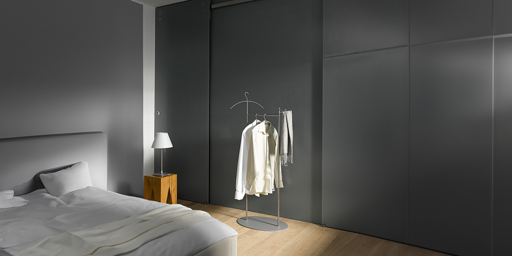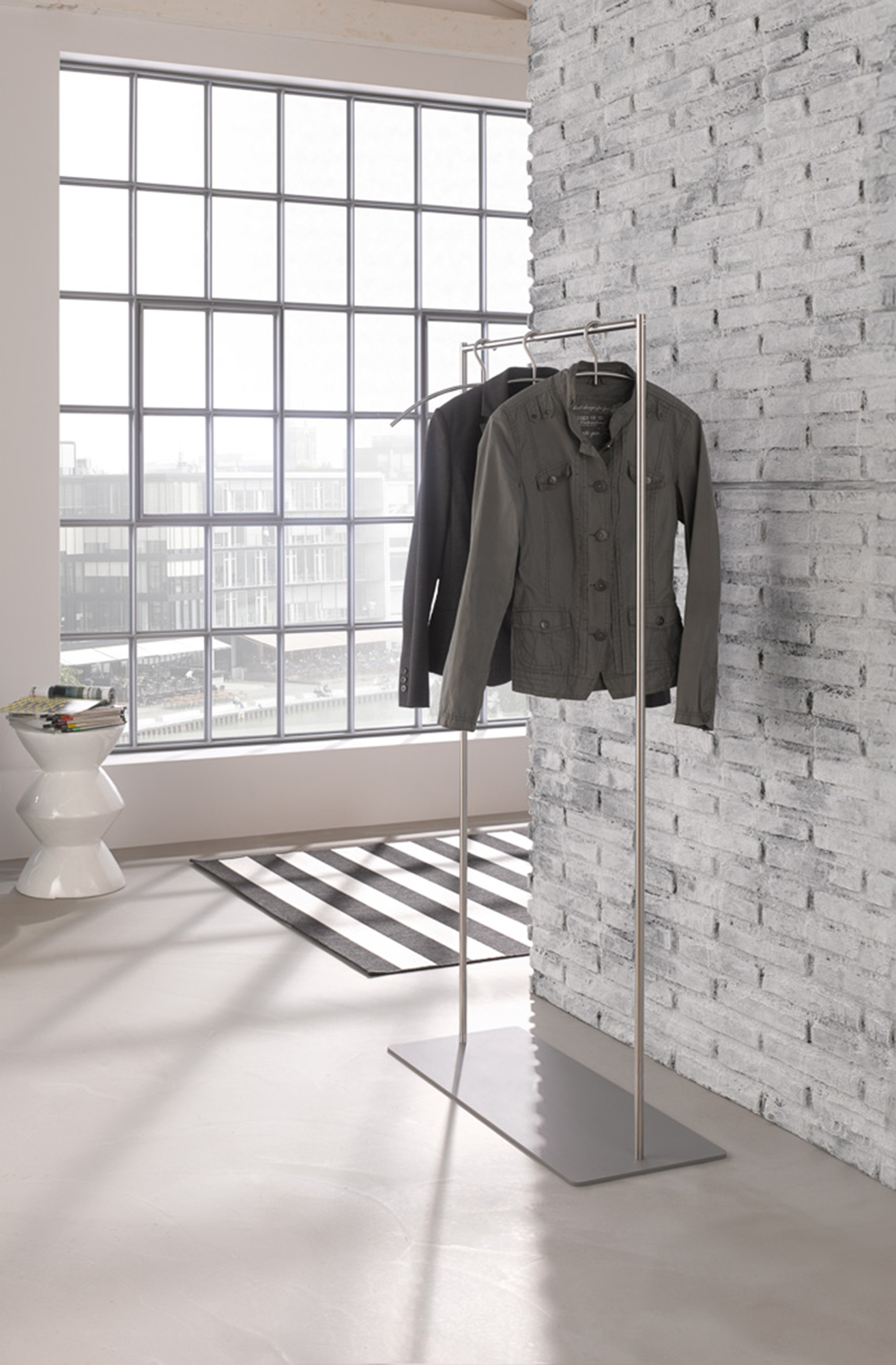 Kleiderständer mit einer Querstange für die Aufnahme von Kleiderbügeln bieten Platz für zahlreiche Kleidungsstücke. Eine schwere Bodenplatte, die wir neben unserer Serien-Hausfarbe Grau-Aluminium (RAL 9007) in verschiedenen Farben anbieten, bildet jeweils die stabile Basis. Von unten werden die vertikalen Stangen aus massivem Edelstahl solide und selbst sichernd verschraubt. Verschiedene Varianten frei stehender Standgarderoben sind möglich. Angelehnt an BAUHAUS Farben bieten wir ebenso farbige pulverbeschichtete Bodenplatten an. Das Spektrum an Farben steht in einem spannenden Kontrast zum puren Edelstahl-Design – aber sehen Sie selbst. Auch in Kombination mit unseren passenden Schuhregalen ergeben sich vielfältige Gestaltungsmöglichkeiten.