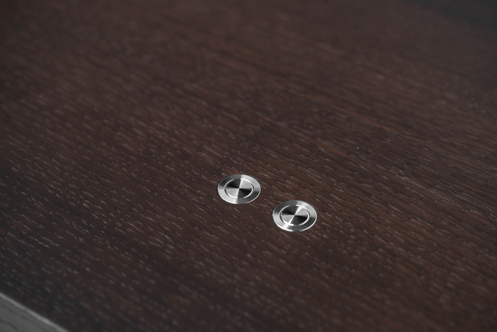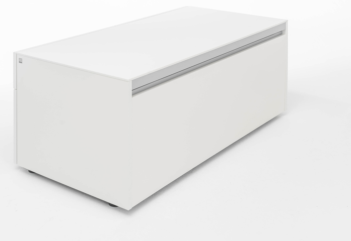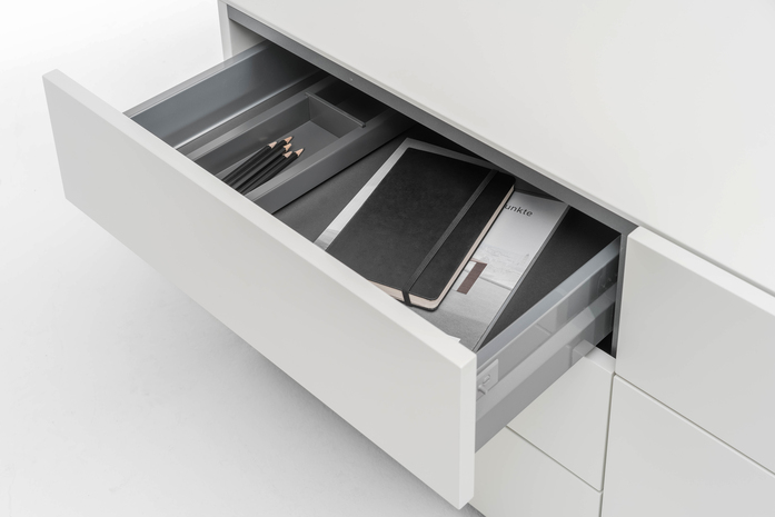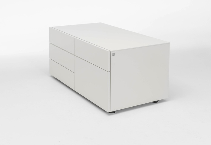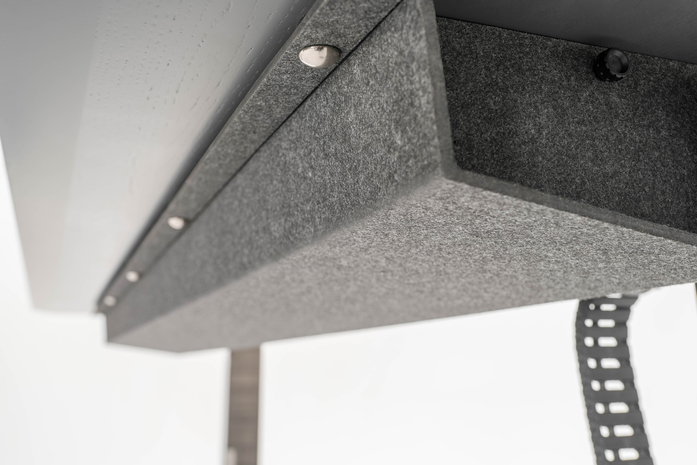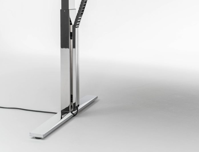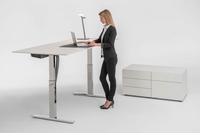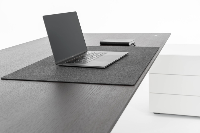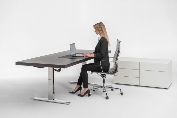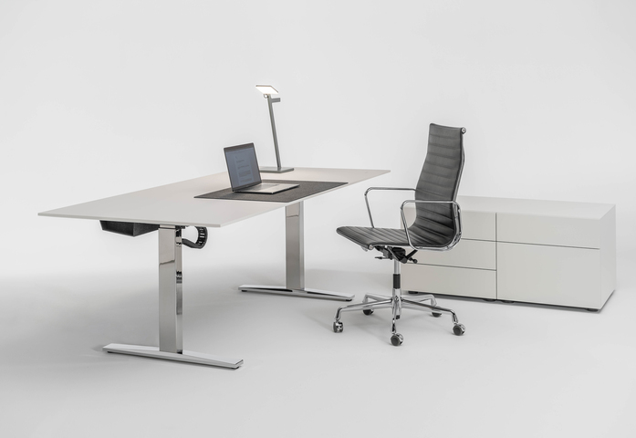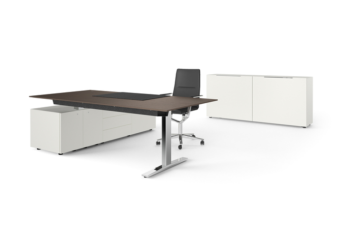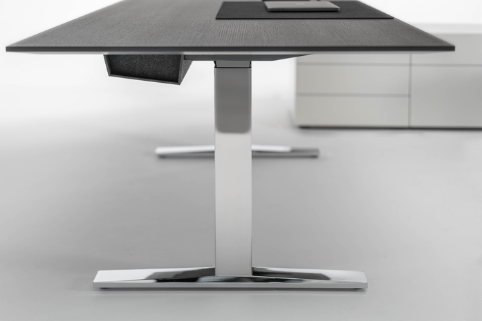 Every day brings new challenges. Being height-adjustable, the executive desk Upsite allows working seated or standing and gives us the freedom to choose. Upsite's strong points are its light and clear design and surfaces of highest quality. The rectangular tabletop appears either slim with a fine edge or more striking with a straight edge. Longitudinally veneered, it rests upon an elegant chrome pedestal of exclusive design. The felt desk pad and cable channel combine warm and cold materials. The two round touch buttons to regulate the height adjustment are embedded evenly into the desk's surface. The table tops come in different dimensions and are available in wood veneer or more durable in Laminate-Nano. The Upsite containers are in line with the design of the storage system Site. Upsite can be used as a standalone desk with a detached container or the desk can be attached to a toolboard - the choice is yours.
