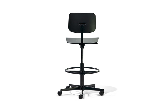 The friendly ›Mr. Square‹ as a high chair. Featuring a comfortable seat and backrest, depth suspension and a gas-damped spring, the chair can be height-adjusted and, thanks to its castors, it’s also easy to move around.