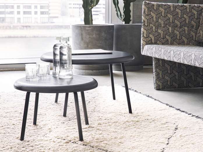 A circular companion for a lounge chair or sofa. The side tables come in a small and a larger size, featuring a solid oak top with a natural or black open-pore finish and a frame available in different colours.