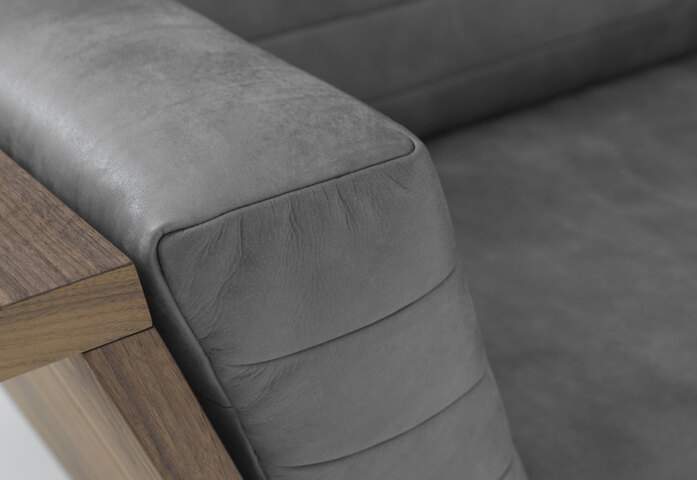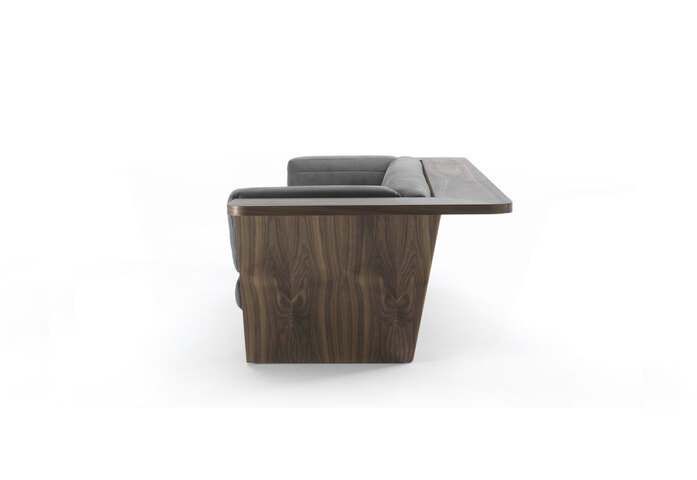 Sofa with wooden shell with support shelf running along the entire perimeter. Unique cushions for seat and back characterized by visible stitching.