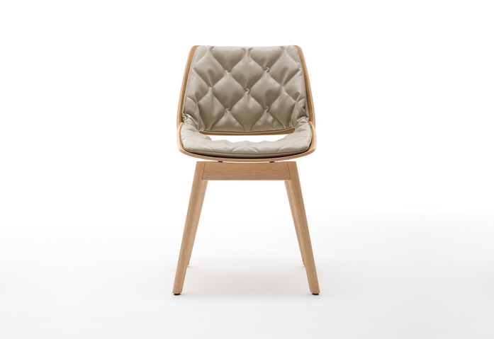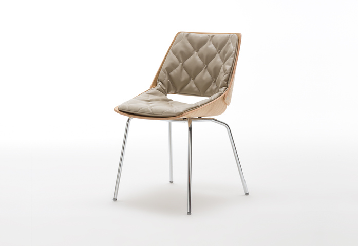With the elegant and extremely adaptable Rolf Benz 650 range of chairs, form and function go hand in hand. This is literally true because the design is inspired by two intertwined hands. The beautiful wood shells made from either oak or walnut ensure maximum seating comfort, resting either dynamically on a frame in the same wood versions with oval feet, or on a slightly angular steel tube underframe, whichever the customer prefers. The metal foot is available in polished chrome or in painted black or grey. The design options for this innovative range of chairs are also plentiful thanks to a sophisticated cover concept: The customised quilted cushion is available in fabric made from 100 % recycled polyester or in breathable artificial leather.