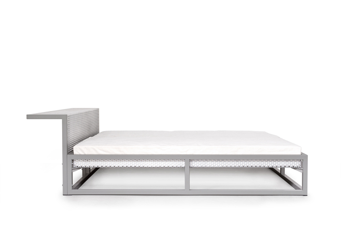 Steel frame with perforated aluminum, with head end. Dimensions cm: bed 209 long (with headrest 244) x 189 wide x 35 high; headrest 70 high. Colors: steel frame stone gray RAL 7030 / gray white RAL 9002 / traffic blue RAL 5017; perforated aluminum anodized clear.