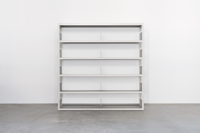 Steel frame (5 storeys) with folded aluminum. Dimensions cm: 150 wide x 34 deep x 195 high. Colors: steel stone gray RAL 7030 / slate gray RAL 7015 / gray white 9002; aluminum anodized clear.