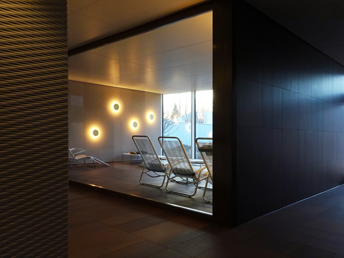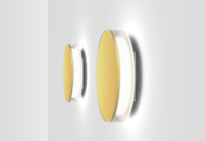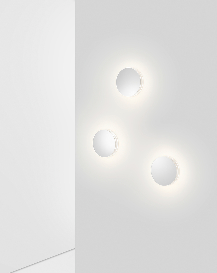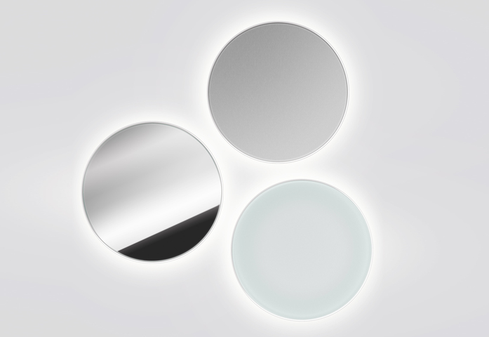 The front disc is available in four different versions: genuine opal glass, silver-colored or champagne-colored aluminum, or mirror glass. Powerful LEDs are located behind it, shedding even wide-angle light on the wall right round. At the same time, the glass edge reflects the light, giving rise to the characteristic line of light. LYD stands out visually from its backgrounds and generates a pleasant, calm light mood.