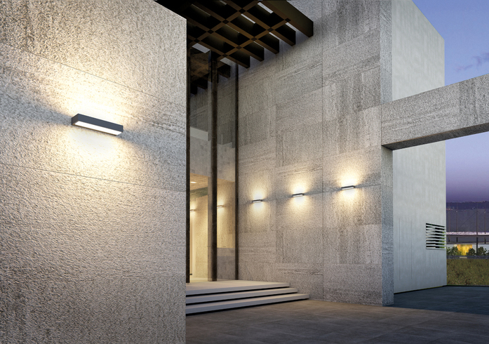 Characterized by its formal design , its simplicity and elegant but firm lighting effect , PLAN is a brand new LED appliqué with single or double light emission . The specific finish of the frosted glass confers a strong lighting impact with a more diffused effect giving the fixture a unique character for outdoor applications.