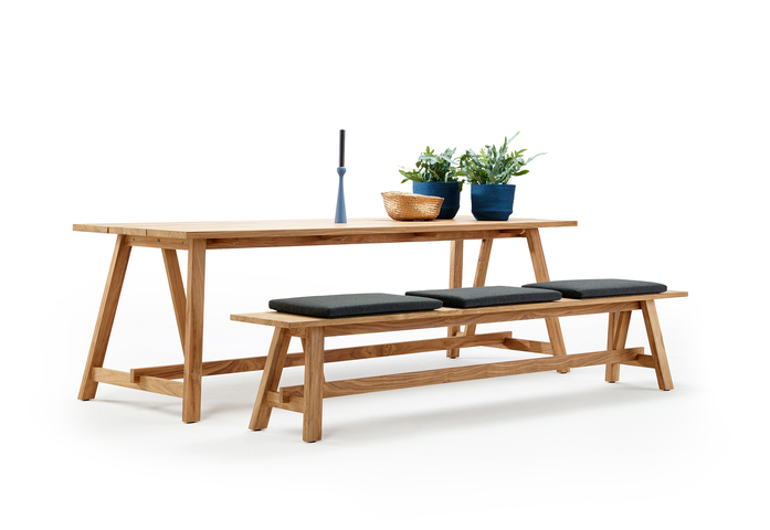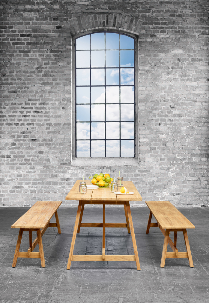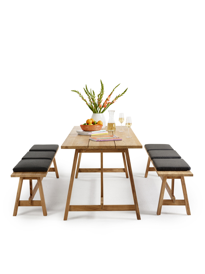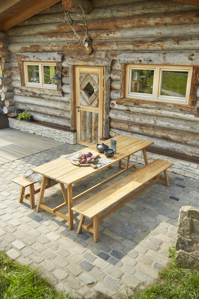 The timeless design of the COUNTRY series made of high-quality teak wood embodies modern country life. The bench and table are characterized by a straight-lined subframe with angled legs and broad longitudinal slats.