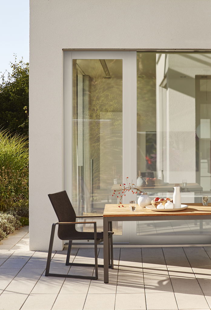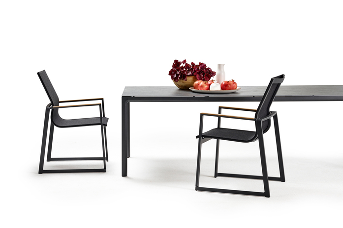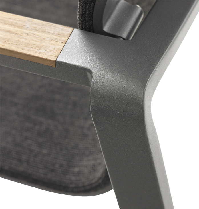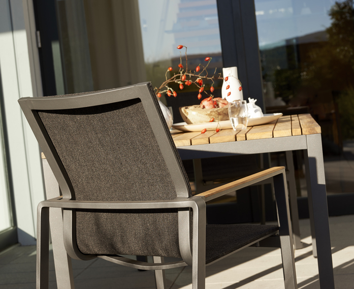 The design of FOXX is distinguished by a modern aluminium frame with a skids bearing an ergonomically shaped Leisuretex seat shell. The flush armrest - optionally teak or aluminium - gives FOXX an elegant look and a pleasant feel.
