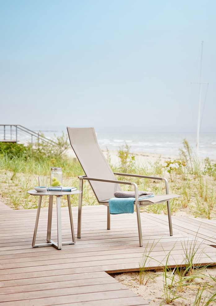 Stainless steel with soft lines was the briefing for the JAZZ collection. The result is a frame made of tubing with a rectangular cross-section. Stainless steel cast parts in the rounded corners create flowing transitions. JAZZ is characterised by its tapered back which lends the furniture its elegant appearance.