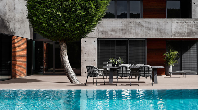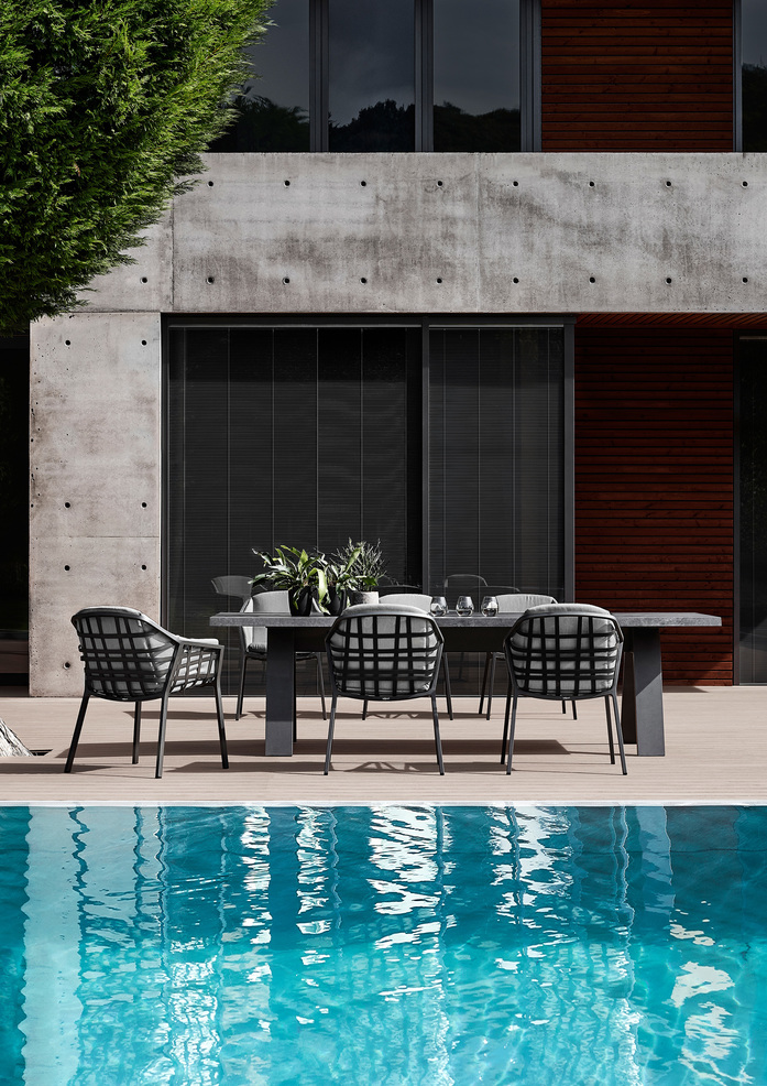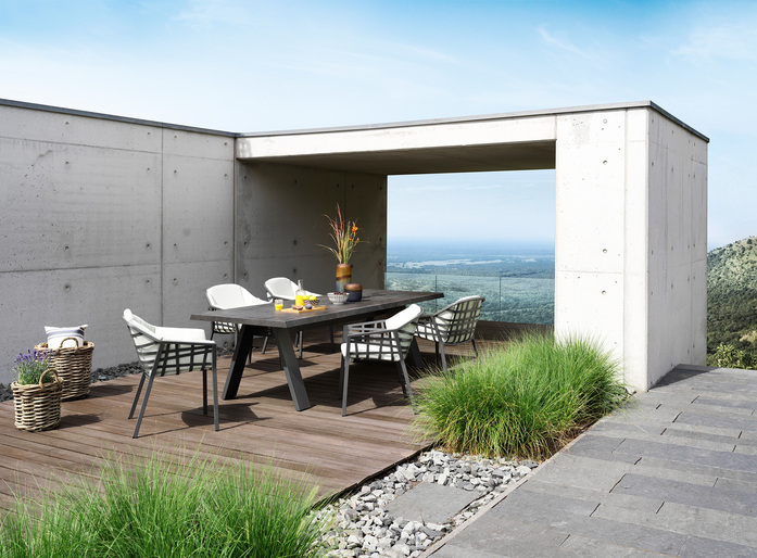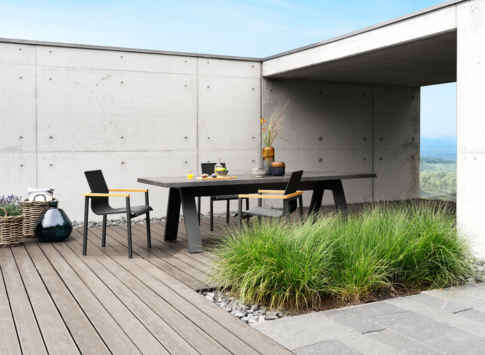 Consisting of a solid-looking ceramic top with bevelled edges and slanted table legs in anthracite-coloured aluminium, the design of the ROCK table adds a stylishly minimalist look to every outdoor space.