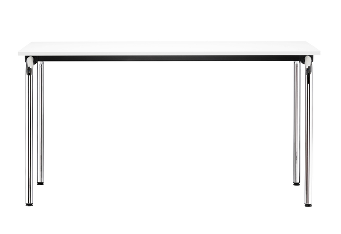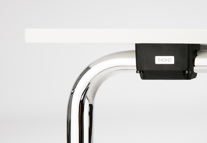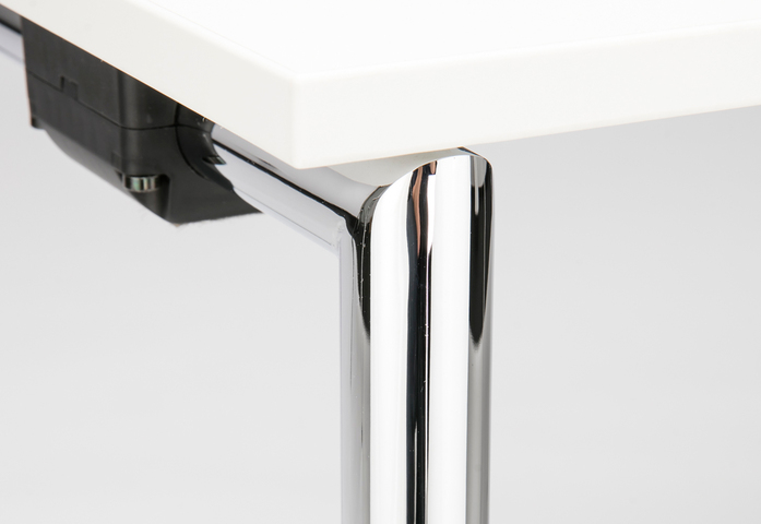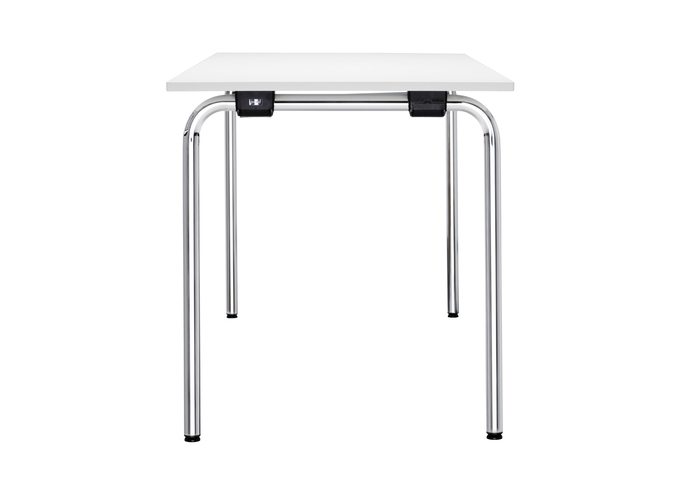 The S 1195 Evo is a folding table that does not give away this practical characteristic at first glance. It has clear, reserved aesthetics and high quality materials and processing. It is mainly used in the training and seminar sector, where its special features best come into play: the large amount of leg room due to the table legs being positioned at the ends of the tabletop, the easy assembly and disassembly, and the space-saving storage since the tables can be perfectly stacked with minimum space required when folded up. Matching carts with a push bracket are available for transport.