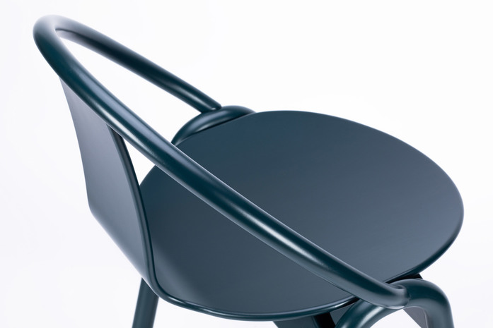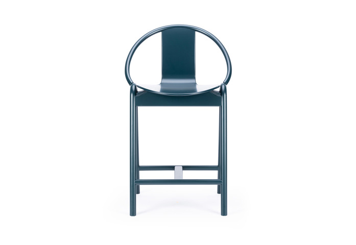 The generous bent form, normally seen in metal furniture, represents a technical challenge when made in wood. The barstool can be finished in three playful variations: a smooth version with no upholstery, a version with an upholstered seat, and a version with an upholstered backrest for hours of comfortable sitting. The barstool is available in two heights.