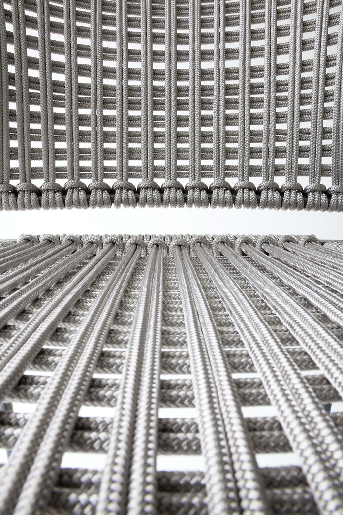 Corda is a modern chair collection consisting of chair, armchair, lounge and barstool that can be used both indoors and outdoors. The painted steel structure is available in two colors, and is combined with the color of the rope, which forms the supporting structure of the seat and back. There are two different types of weaving, both hand woven, to select from. The simplest version, recalls the form of a fishing net, whilst the more elaborate version, (the result of a very laborious technical processing) uses a series of knots similar to those used on sailboats or with ropes used in mountaineering. For the elaborate version there is a considerable increase in the quantity of material used.